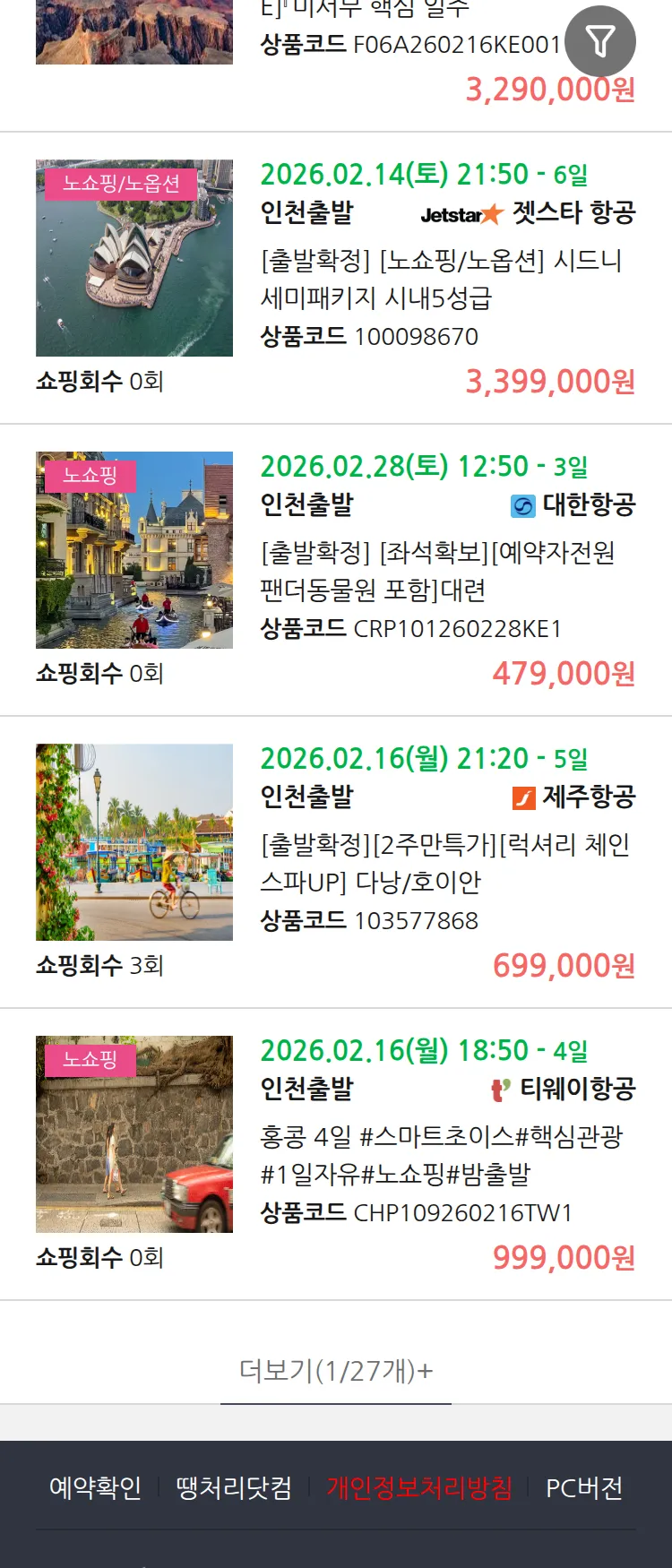 (1월 12일(월)) 땡처리 99.9% 확정 패키지