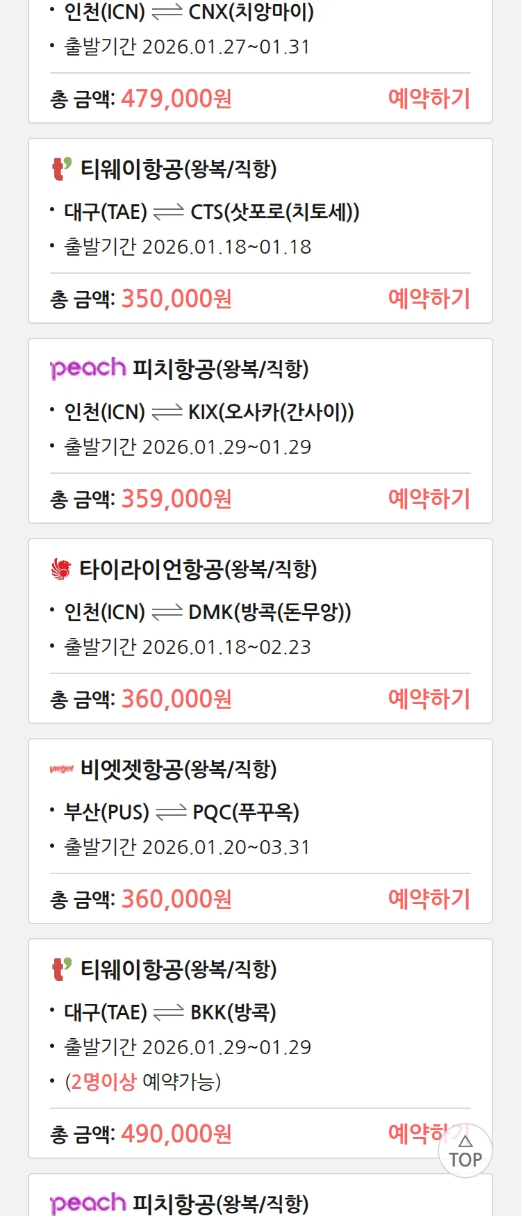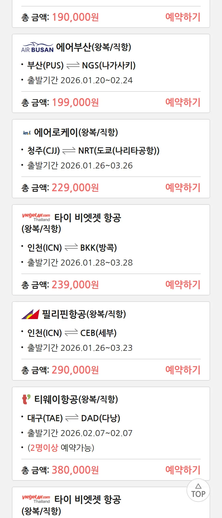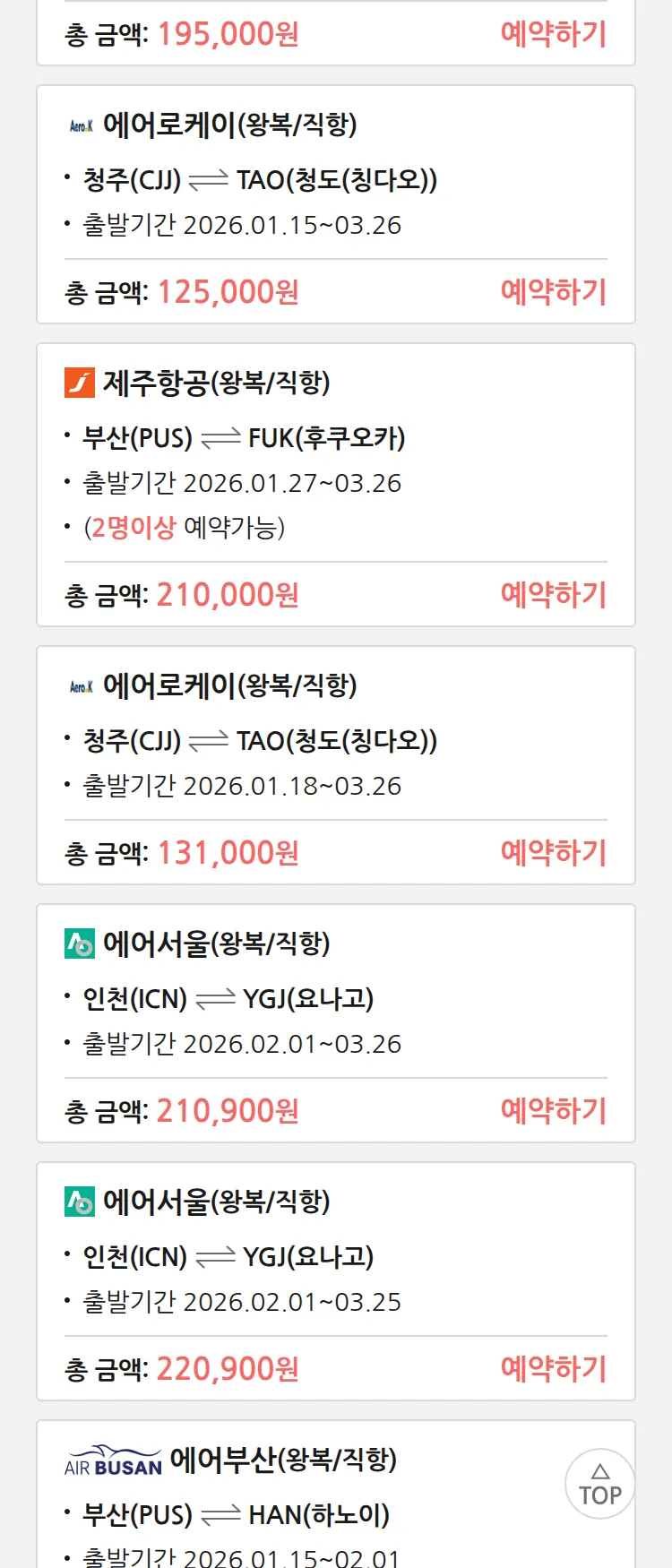 (1월 10일(토)) 땡처리 특가 항공권