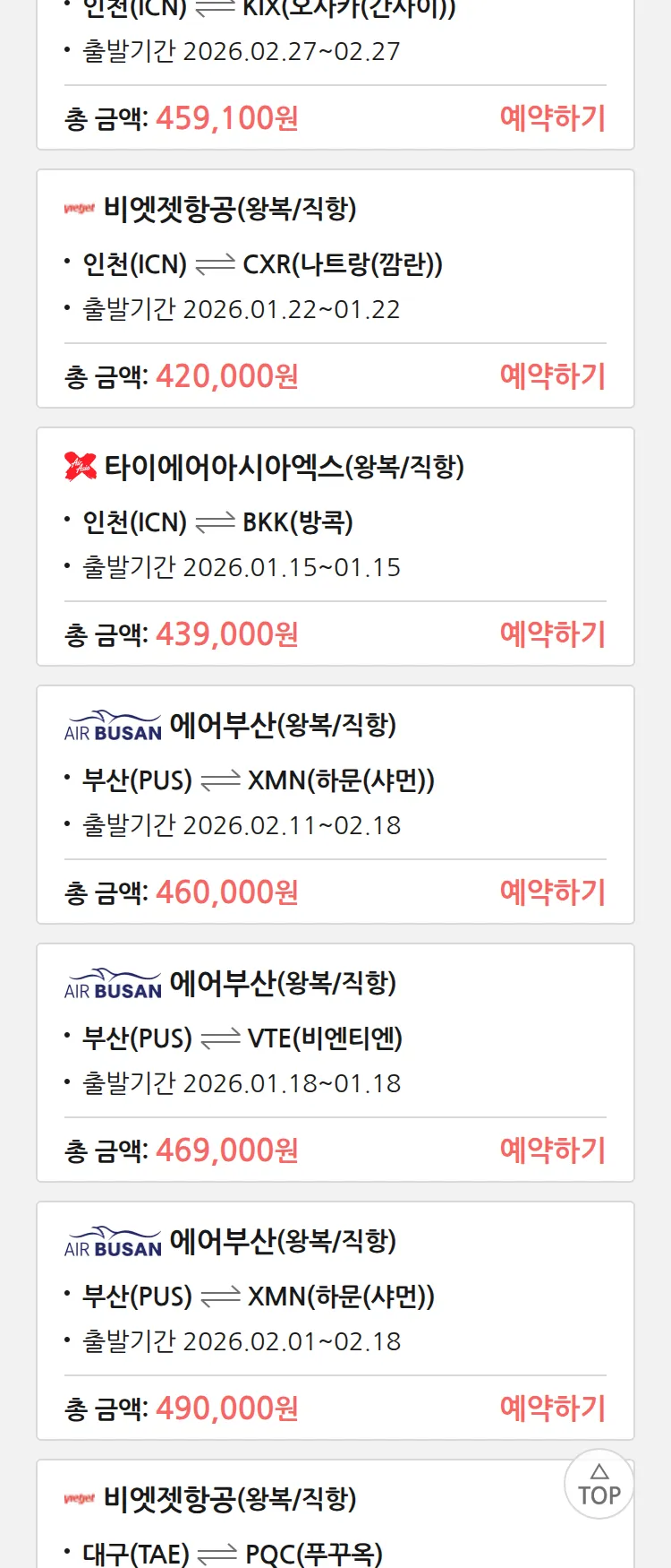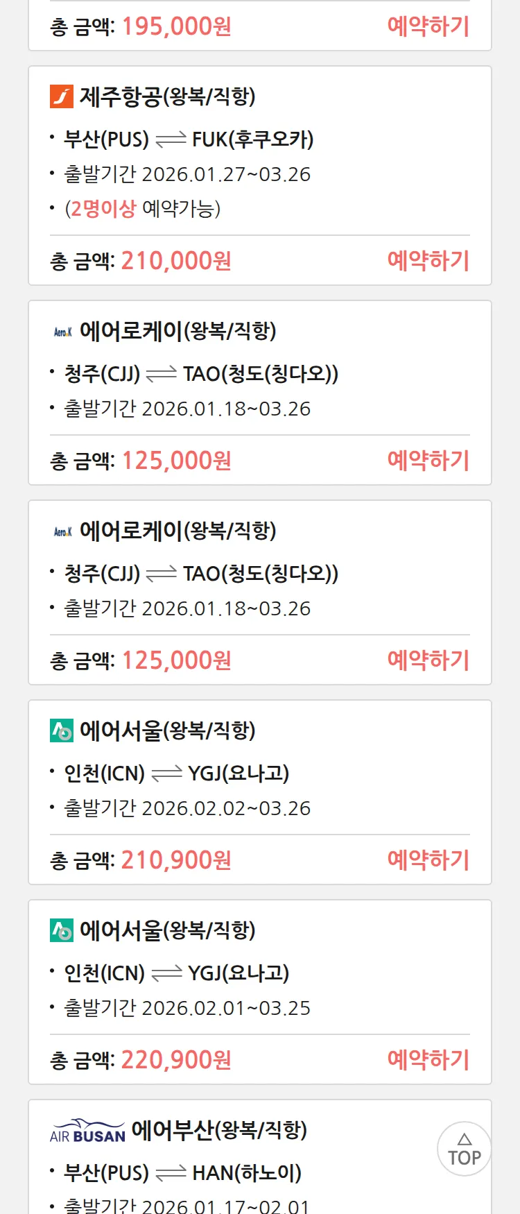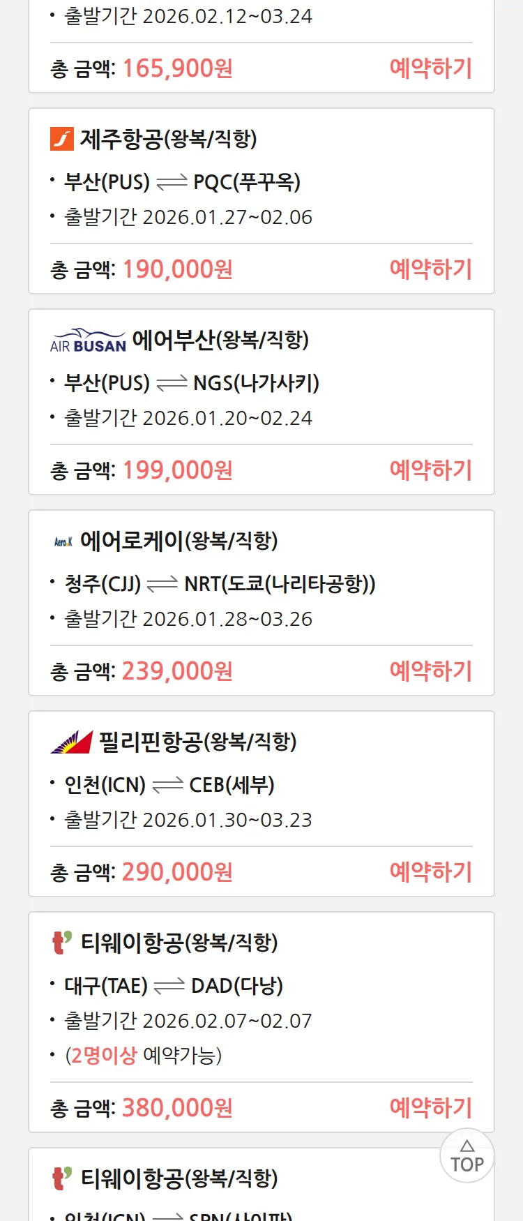 (1월 12일(월)) 땡처리 특가 항공권