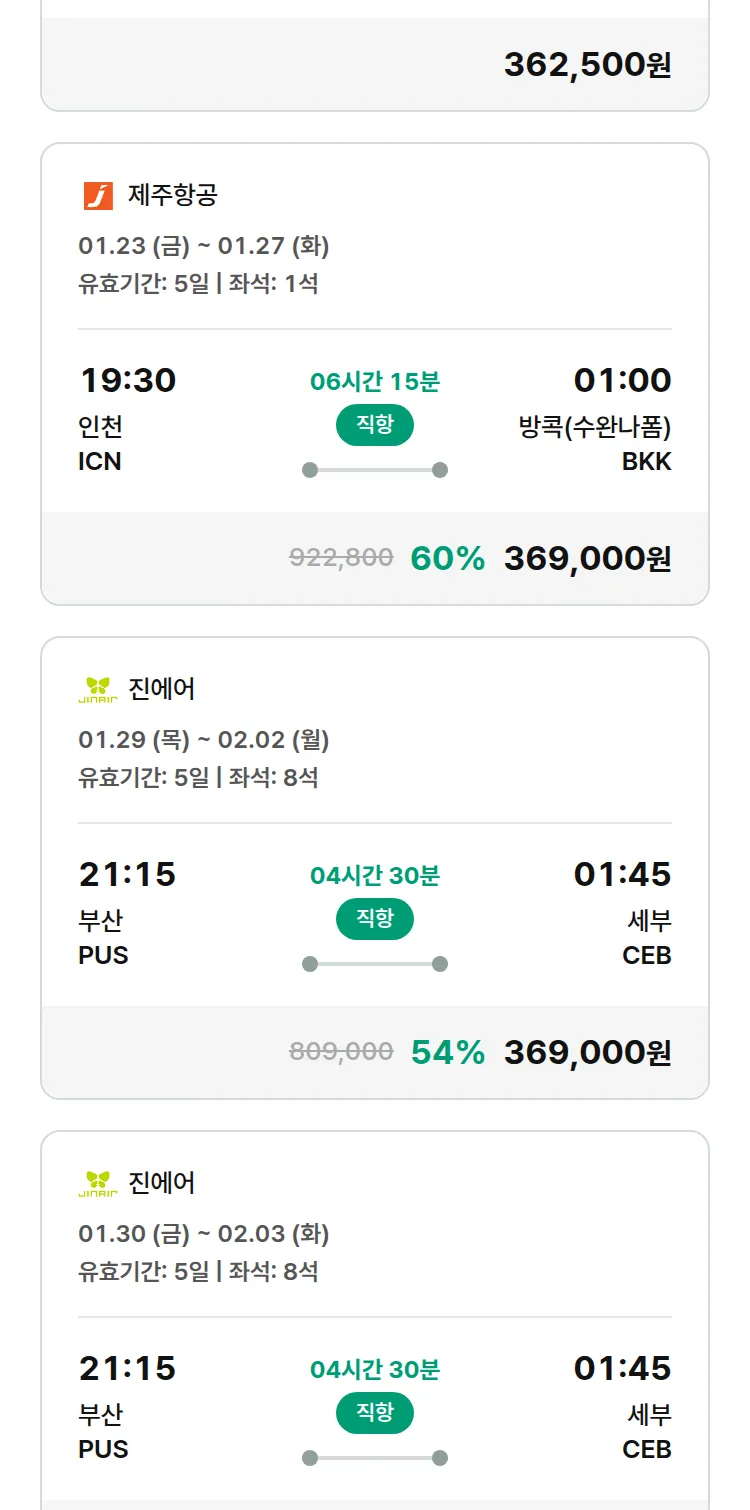 (1월 15일(목)) 땡처리 특가 항공권