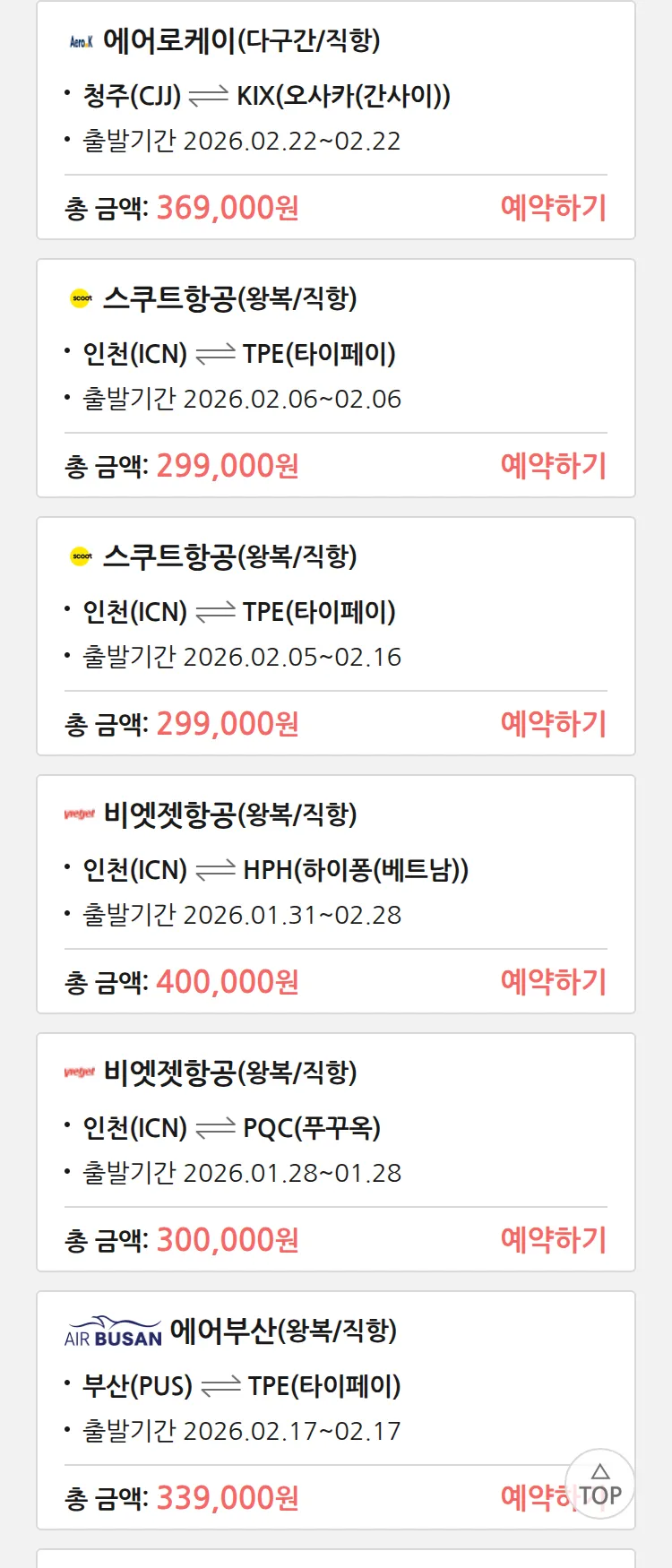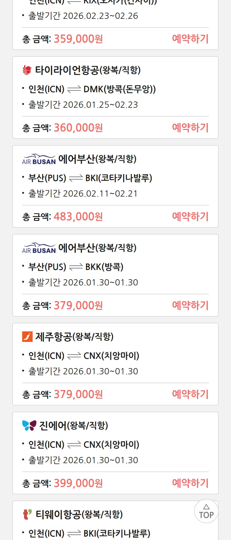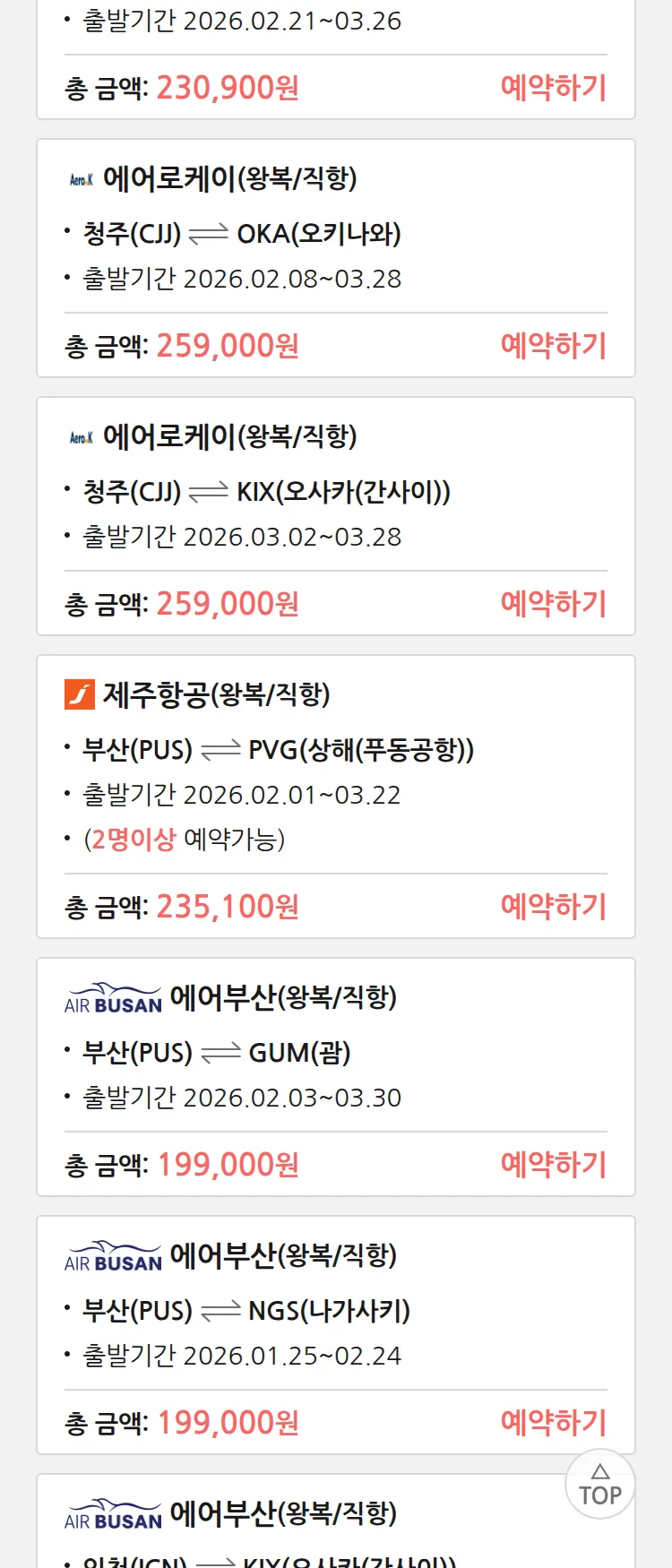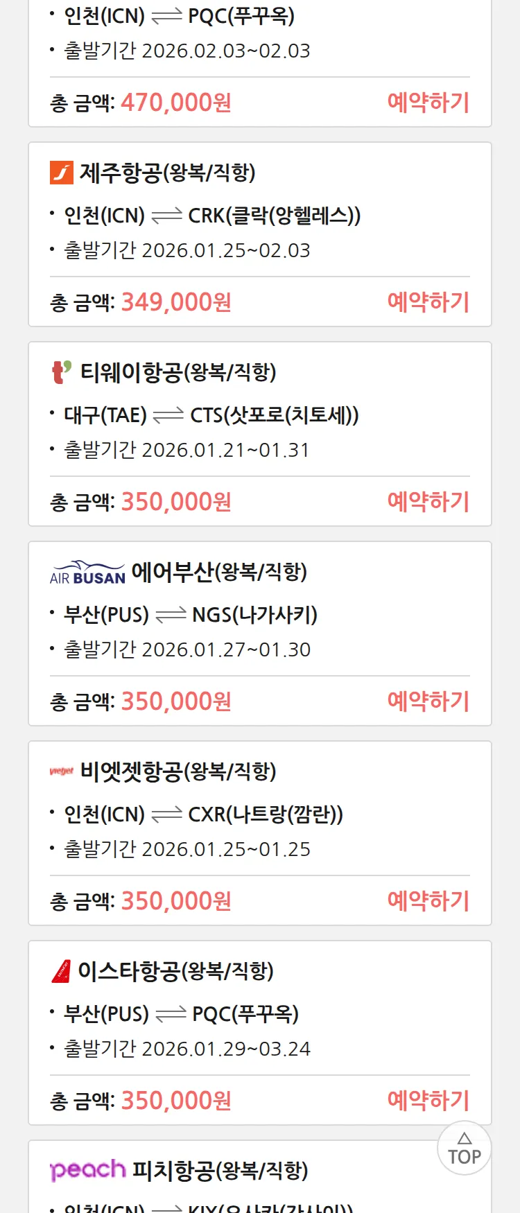 (1월 18일(일)) 땡처리 특가 항공권