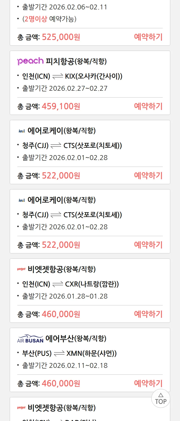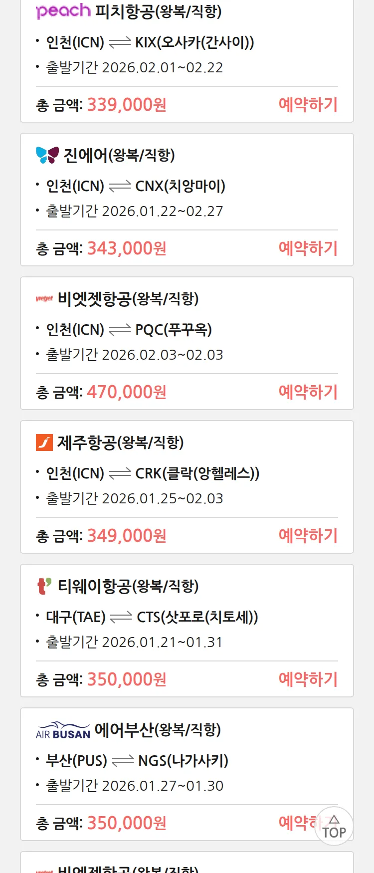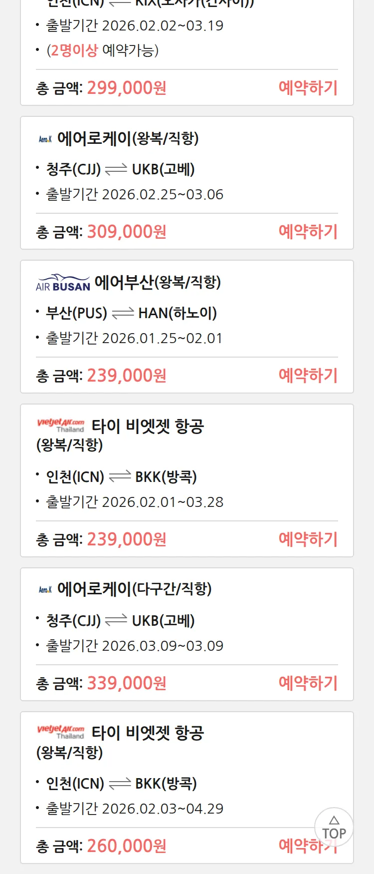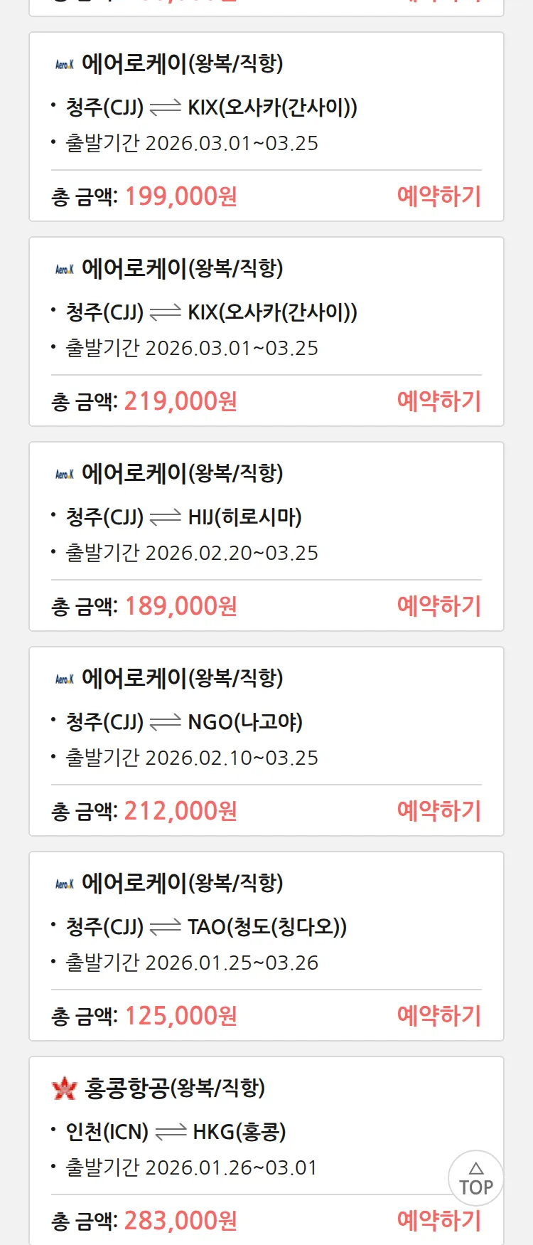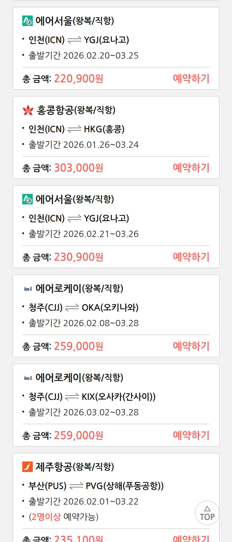 (1월 18일(일)) 땡처리 특가 항공권