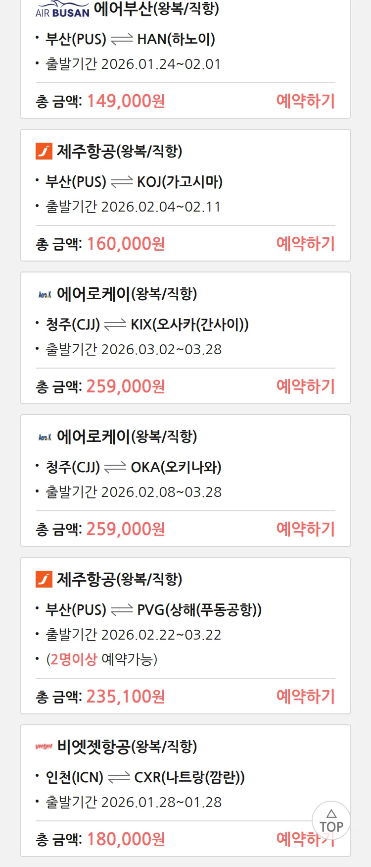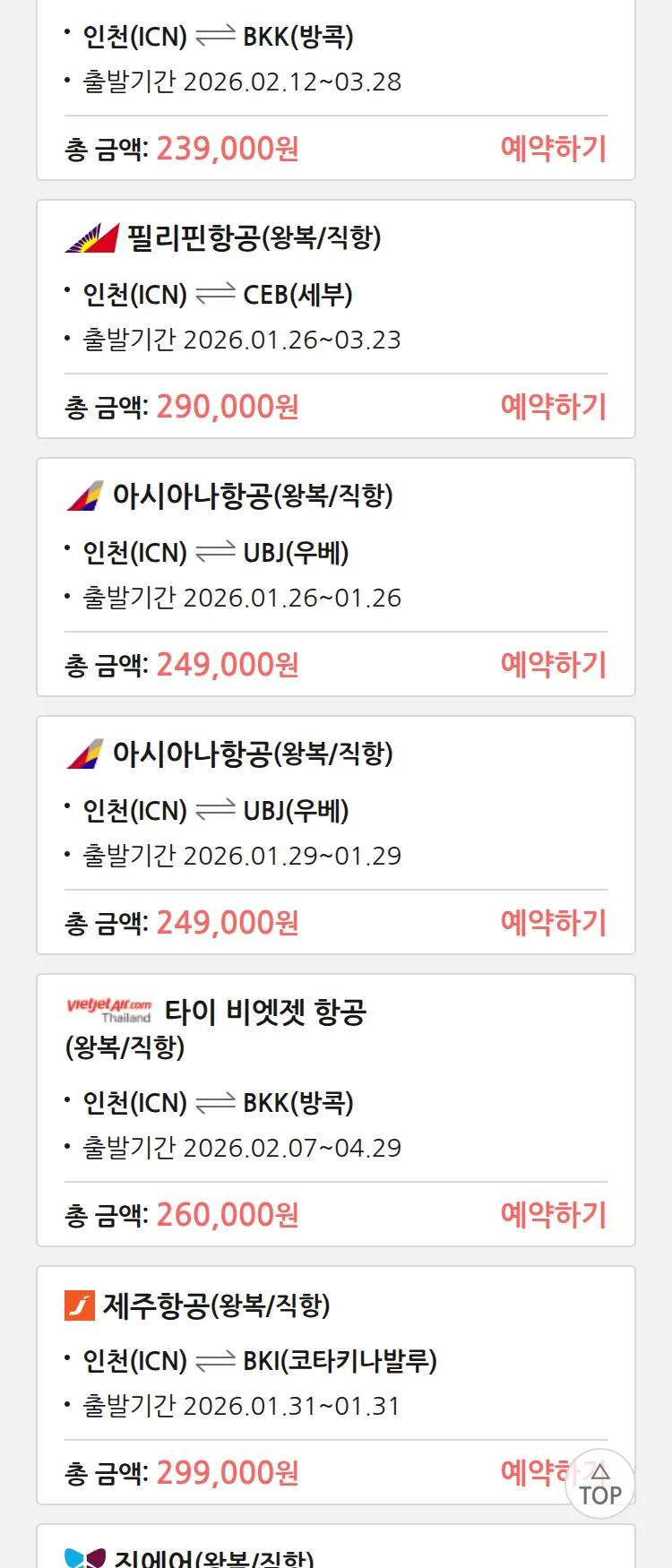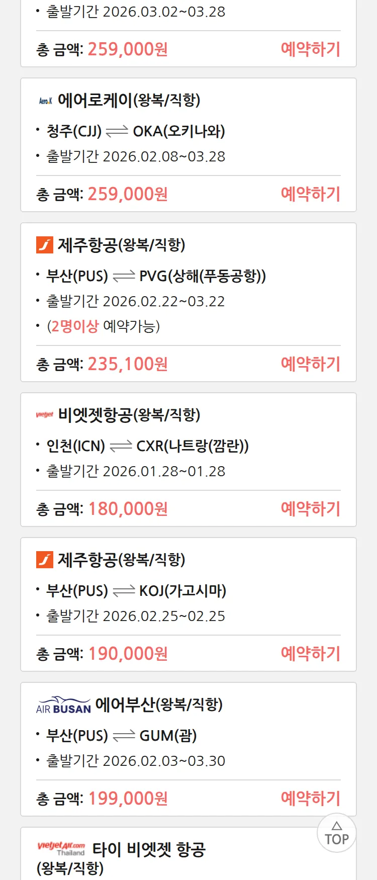 (1월 22일(목)) 땡처리 특가 항공권