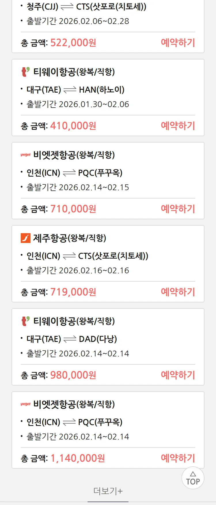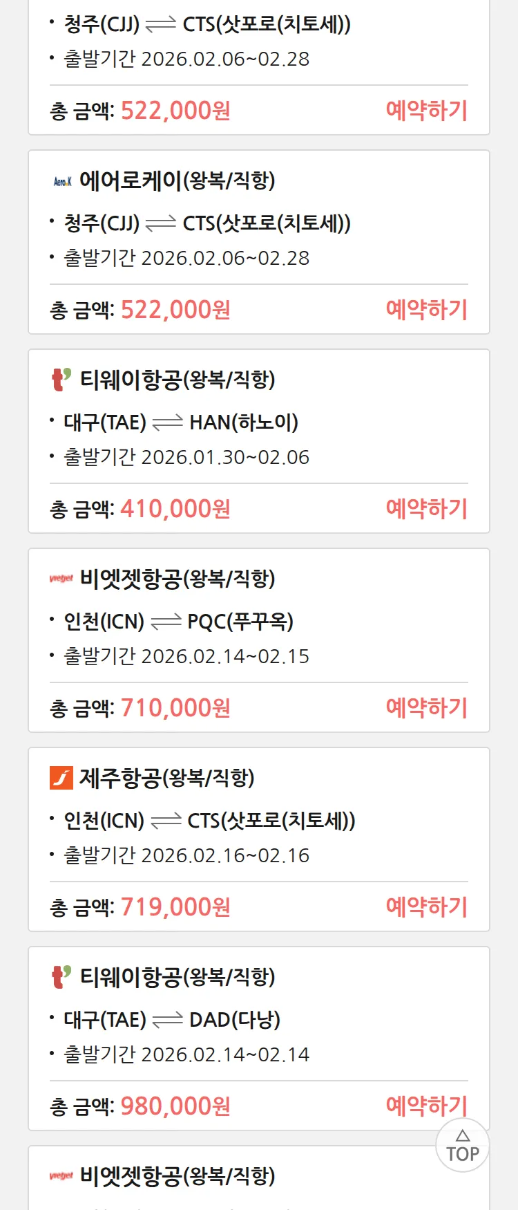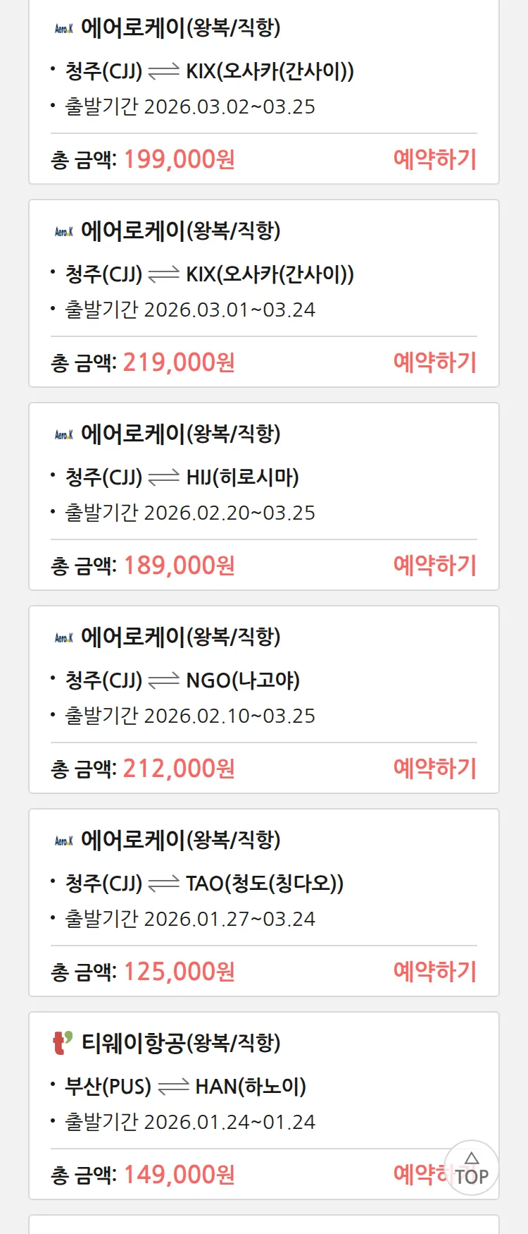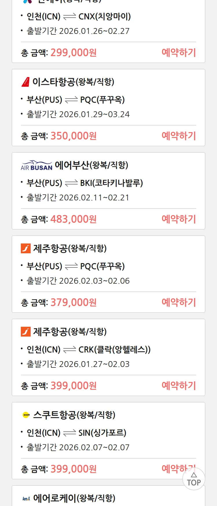 (1월 22일(목)) 땡처리 특가 항공권