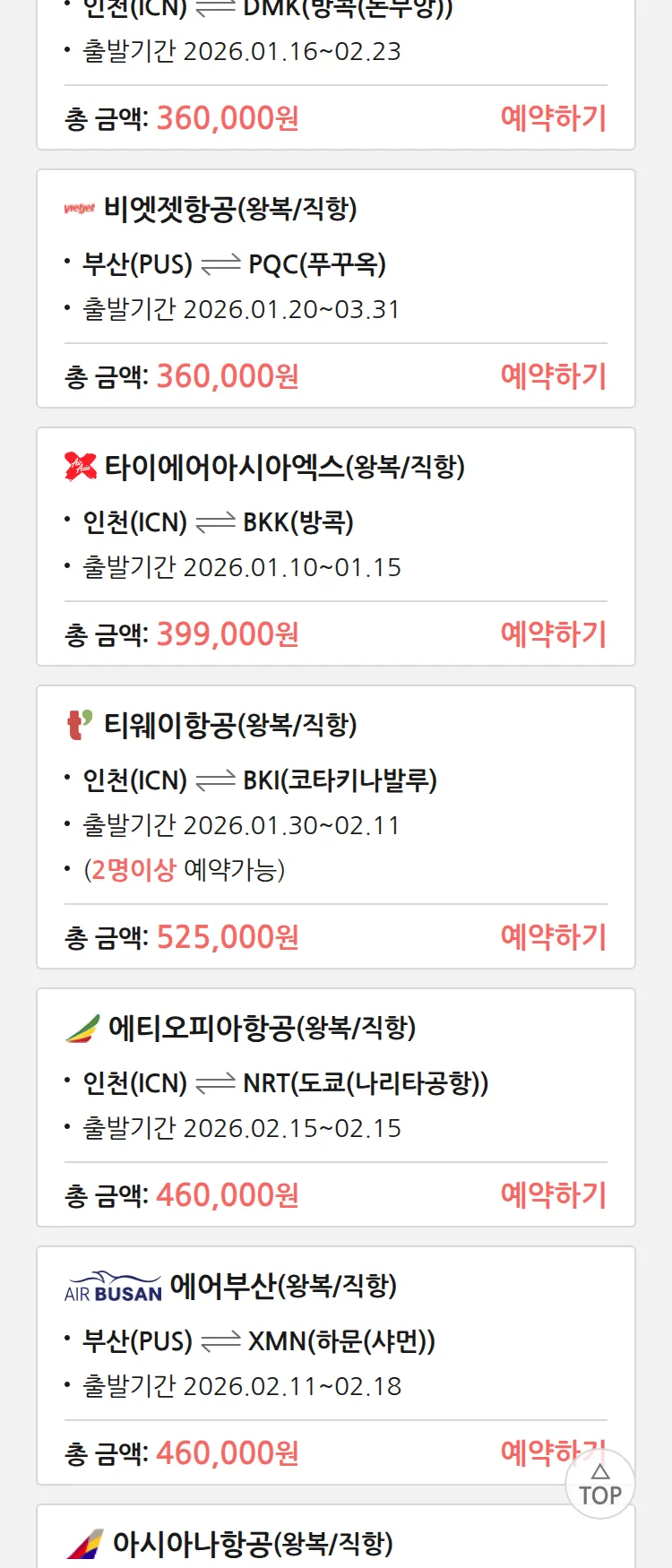 (1월8일(목)) 모두투어 동남아 특가 항공권