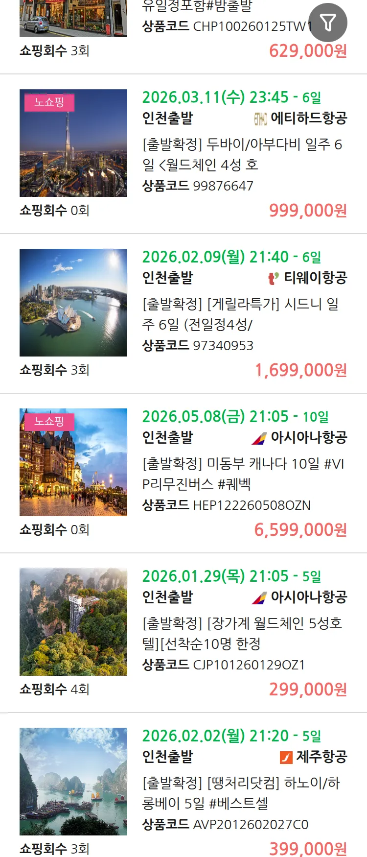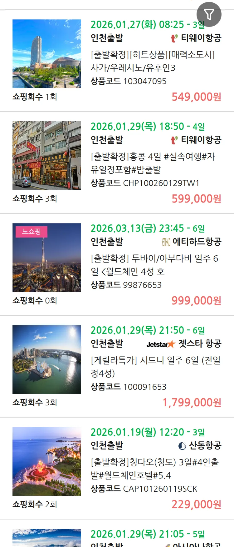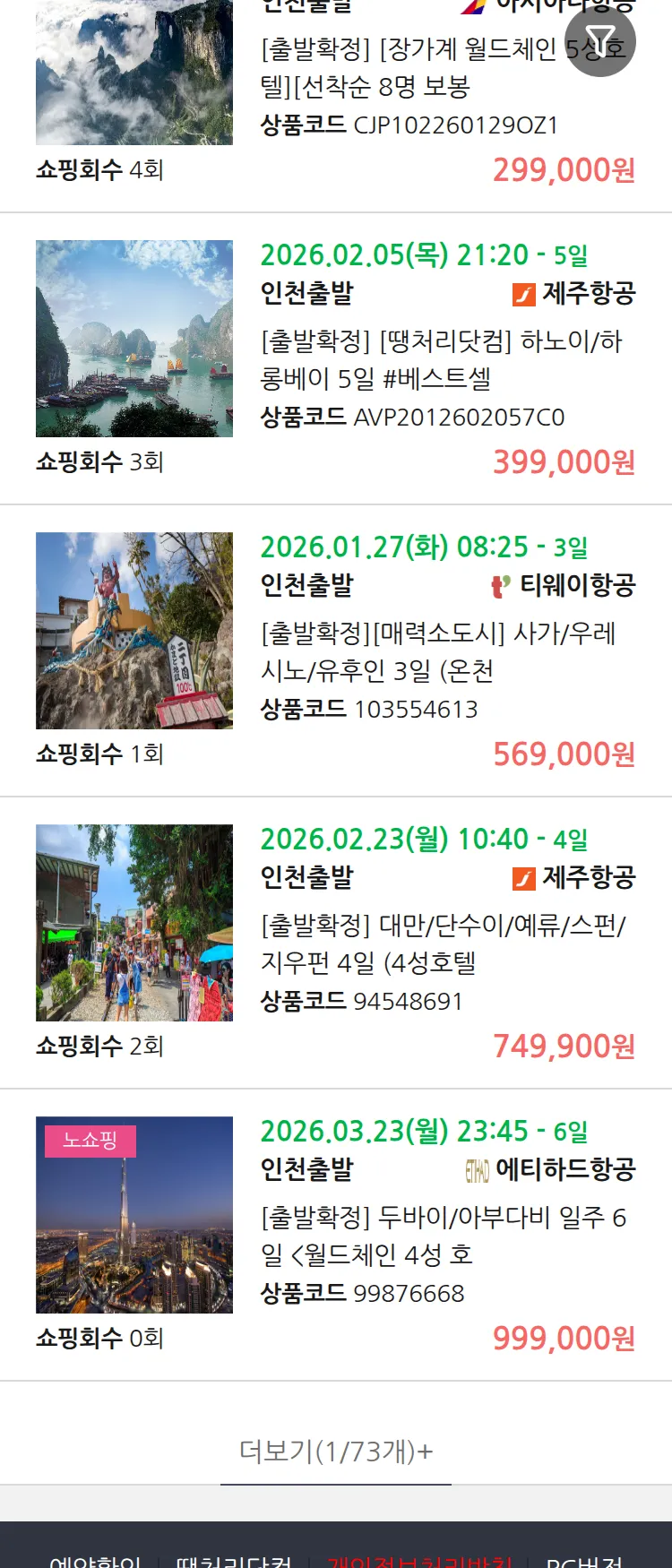 (1월7일(수)) 땡처리 99.9% 확정 패키지