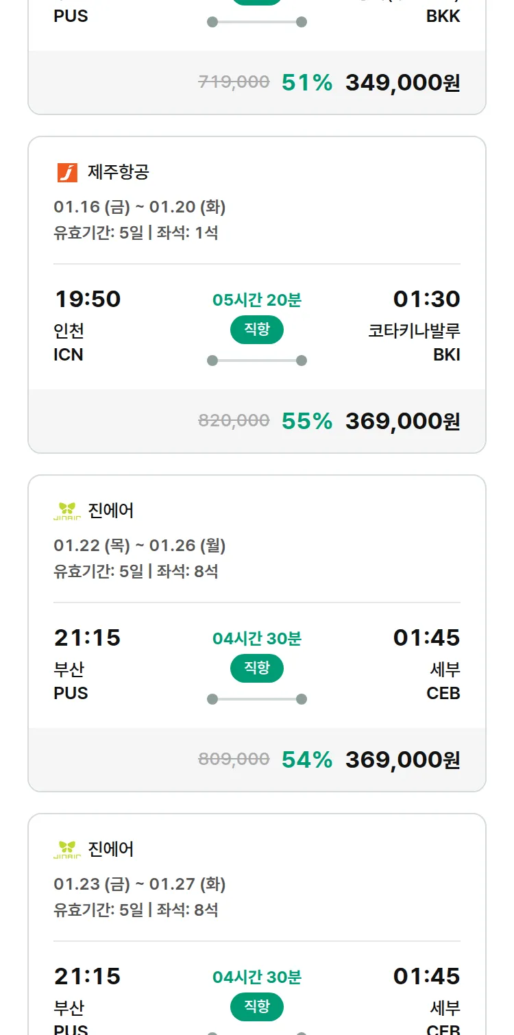 (1월8일(목)) 땡처리 특가 항공권