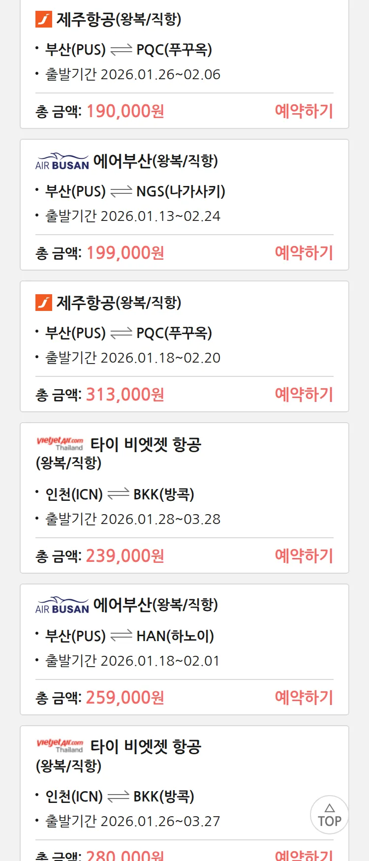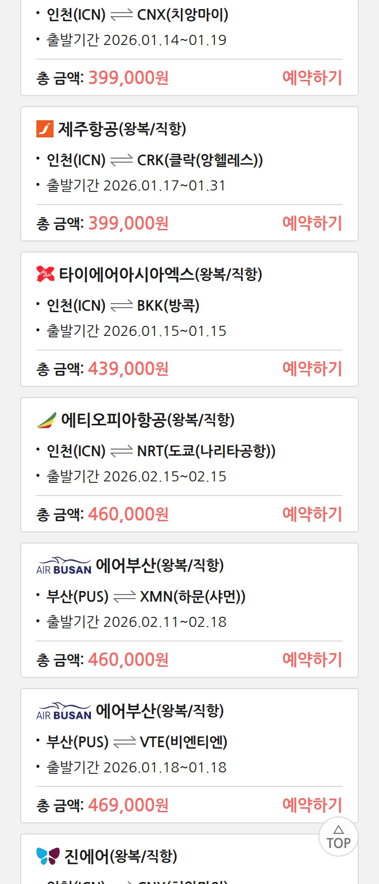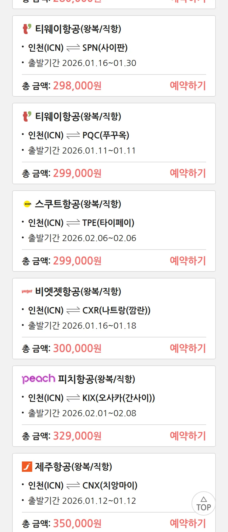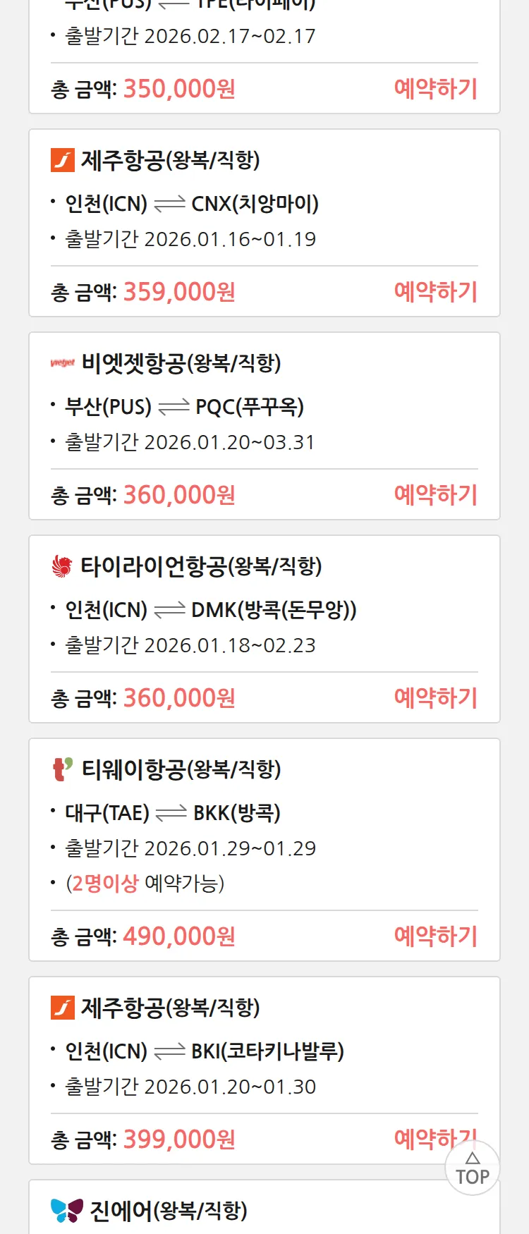 (1월 10일(토)) 땡처리 특가 항공권