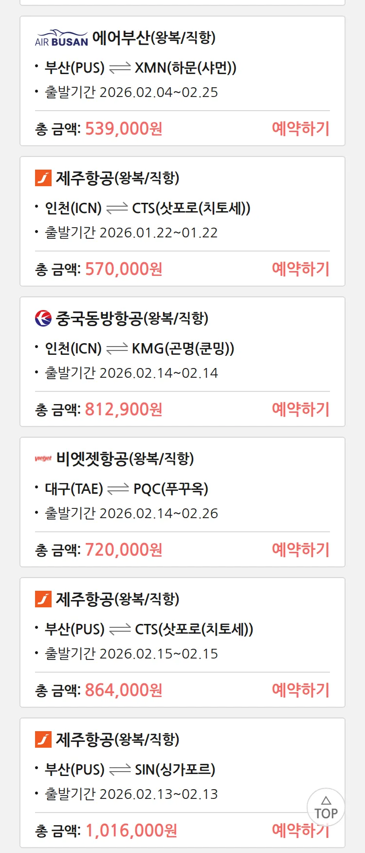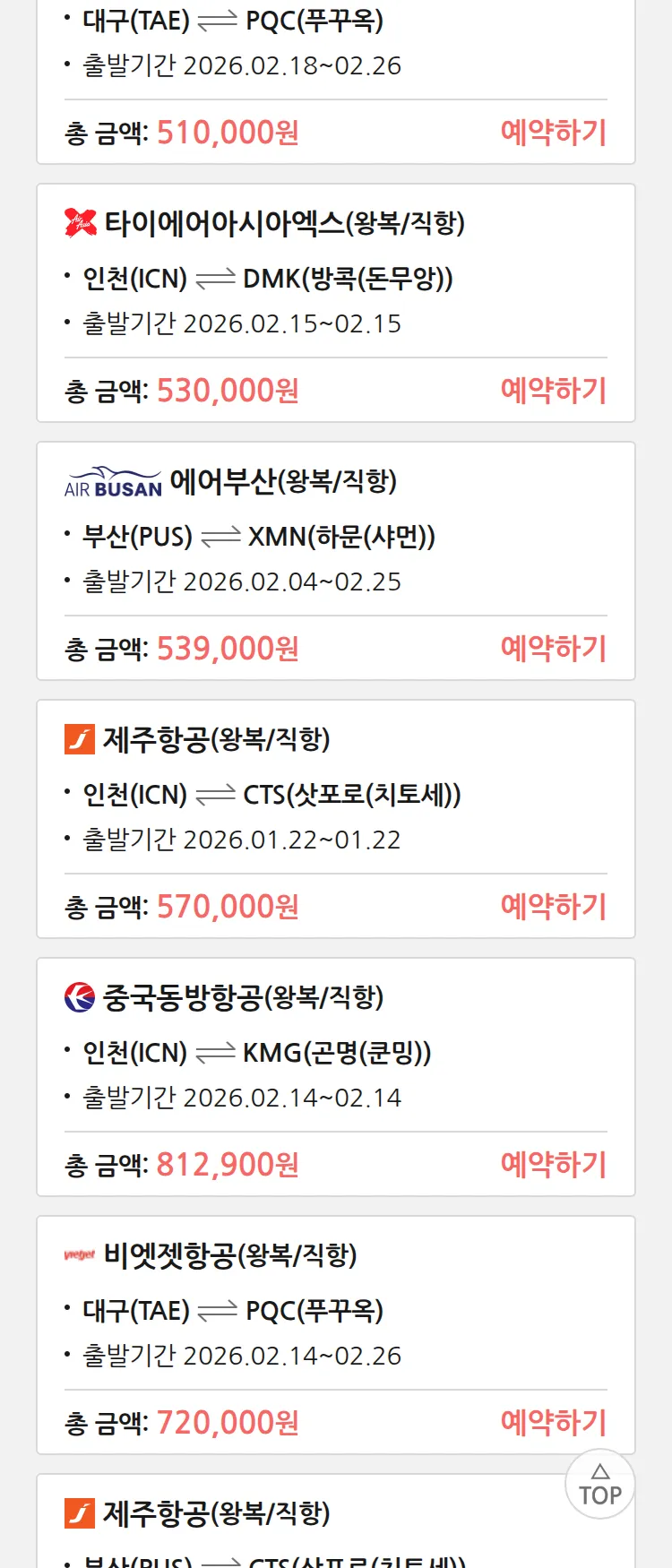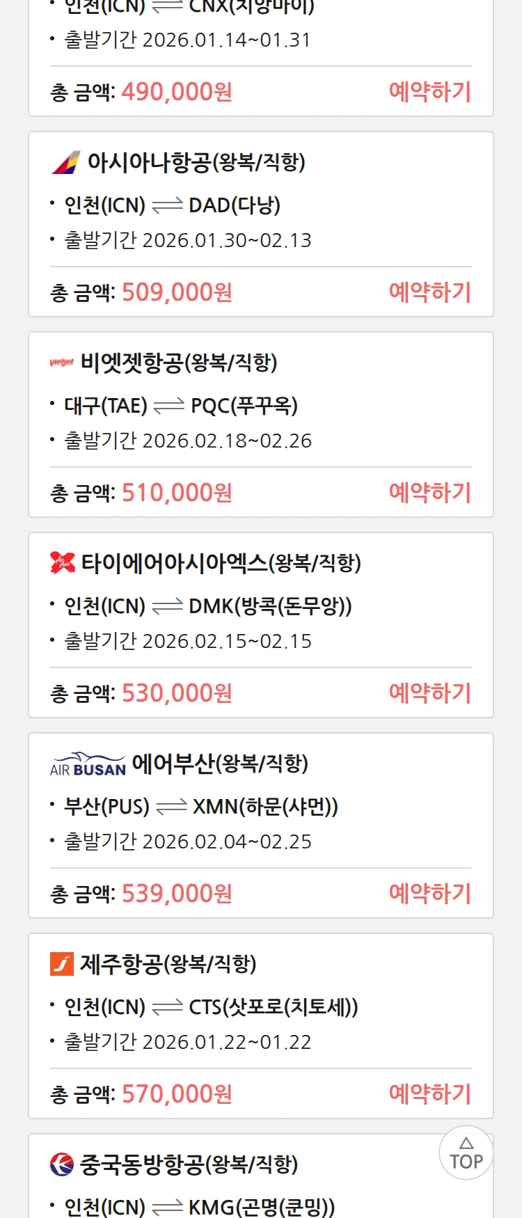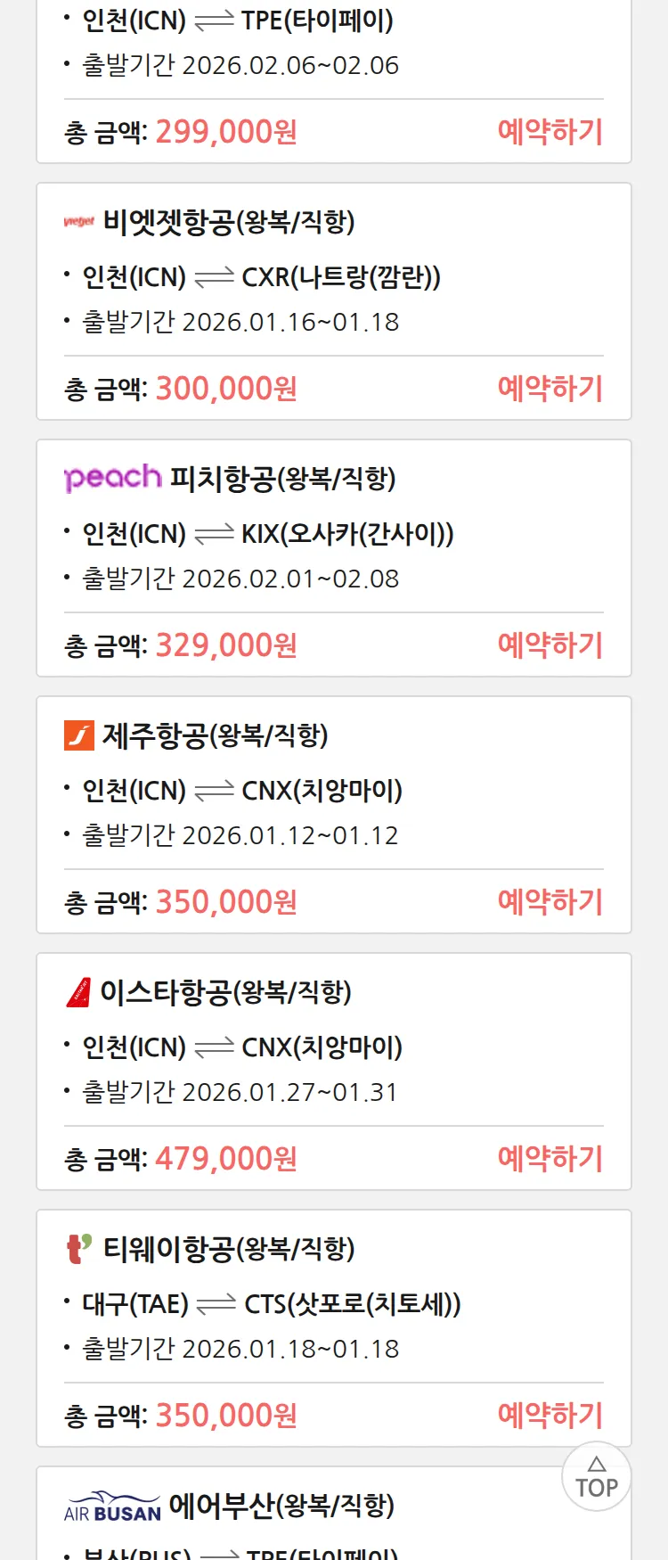 (1월 10일(토)) 땡처리 특가 항공권