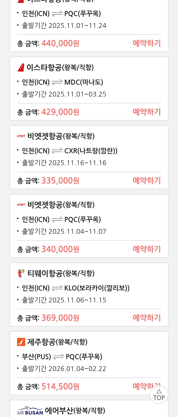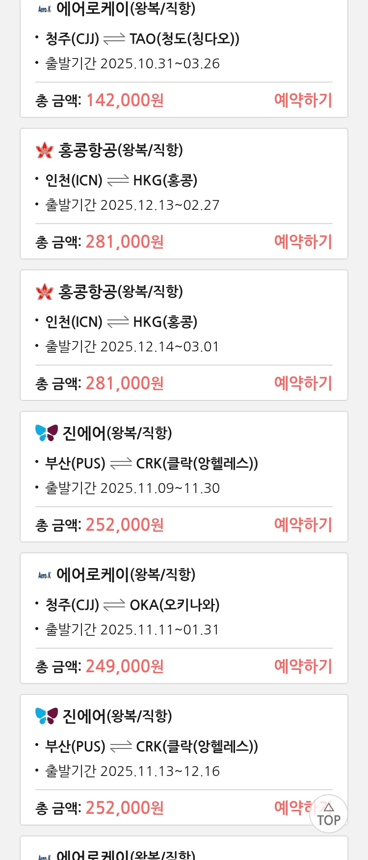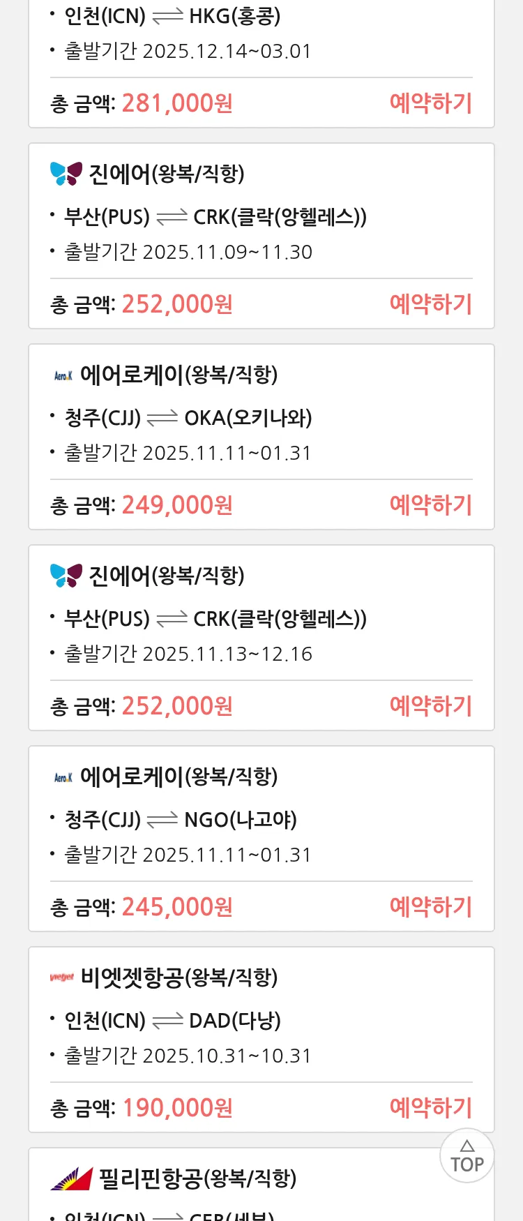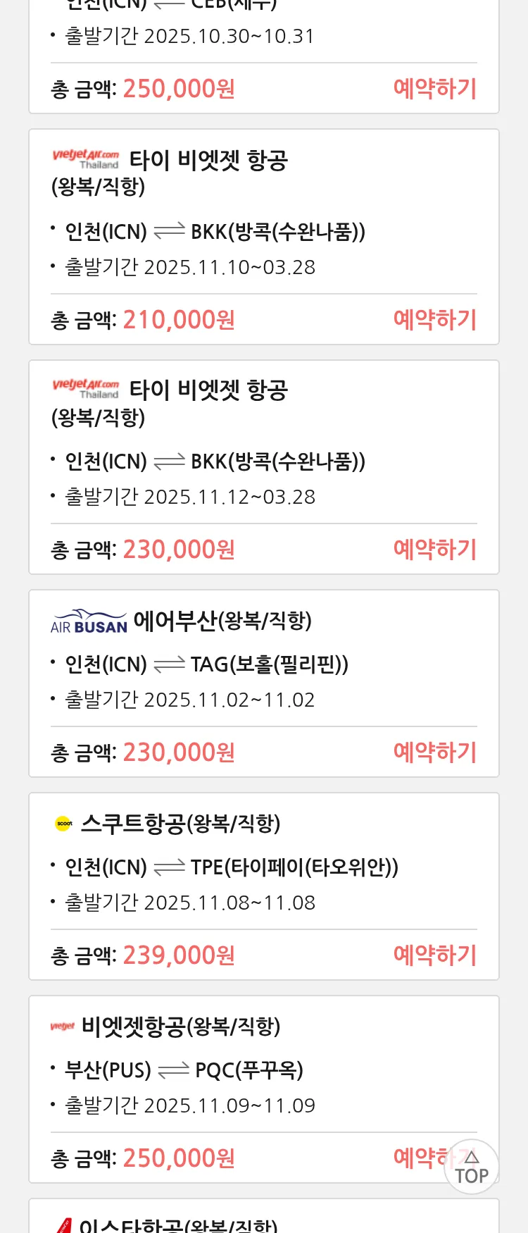 (10월 25일(토)) 땡처리 특가 항공권
