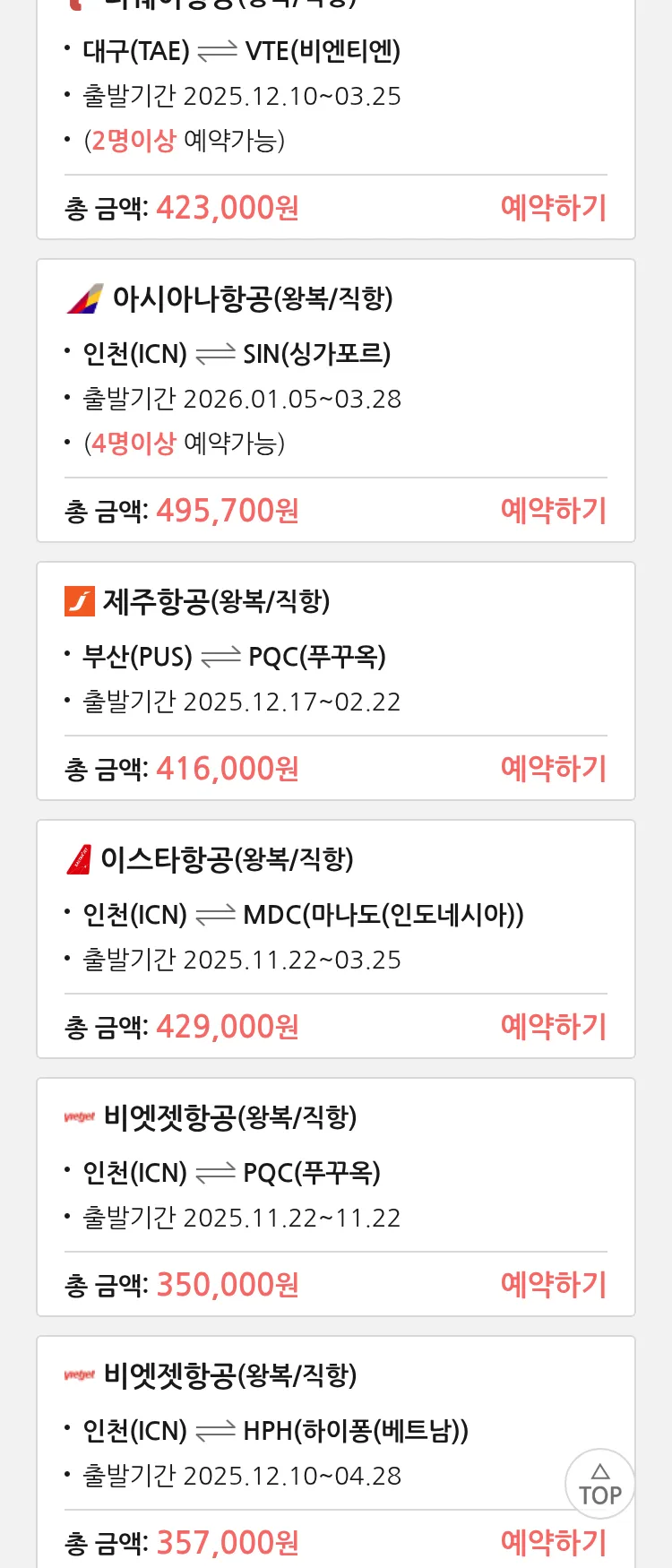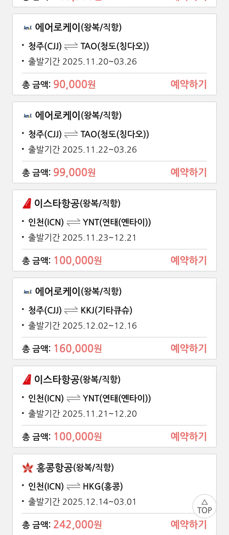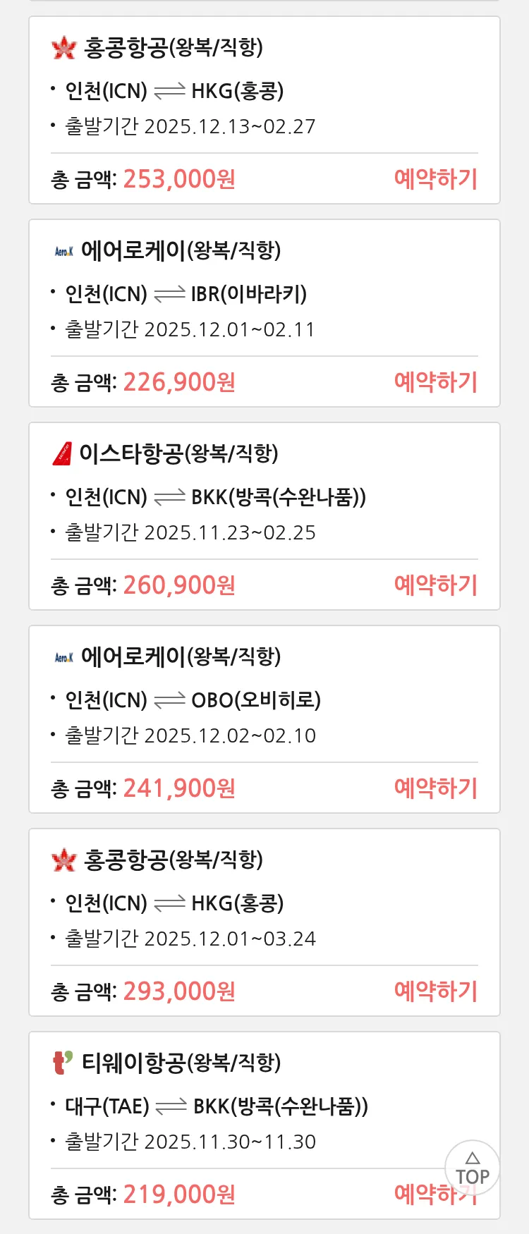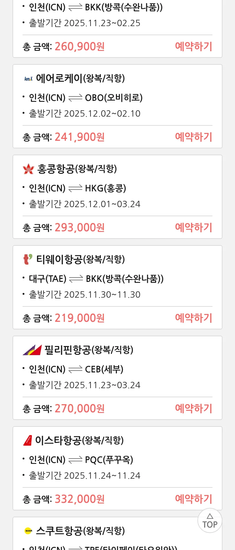 (11월 16일(일)) 땡처리 특가 항공권