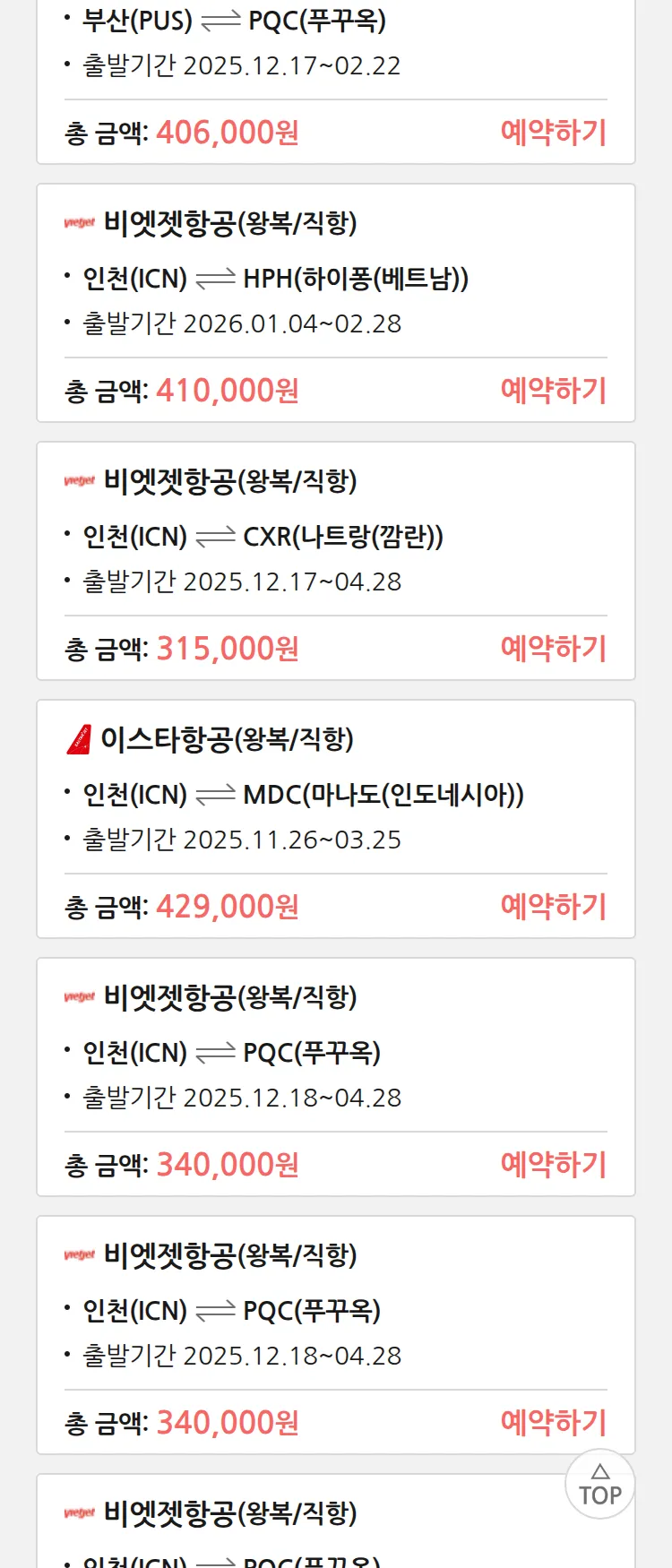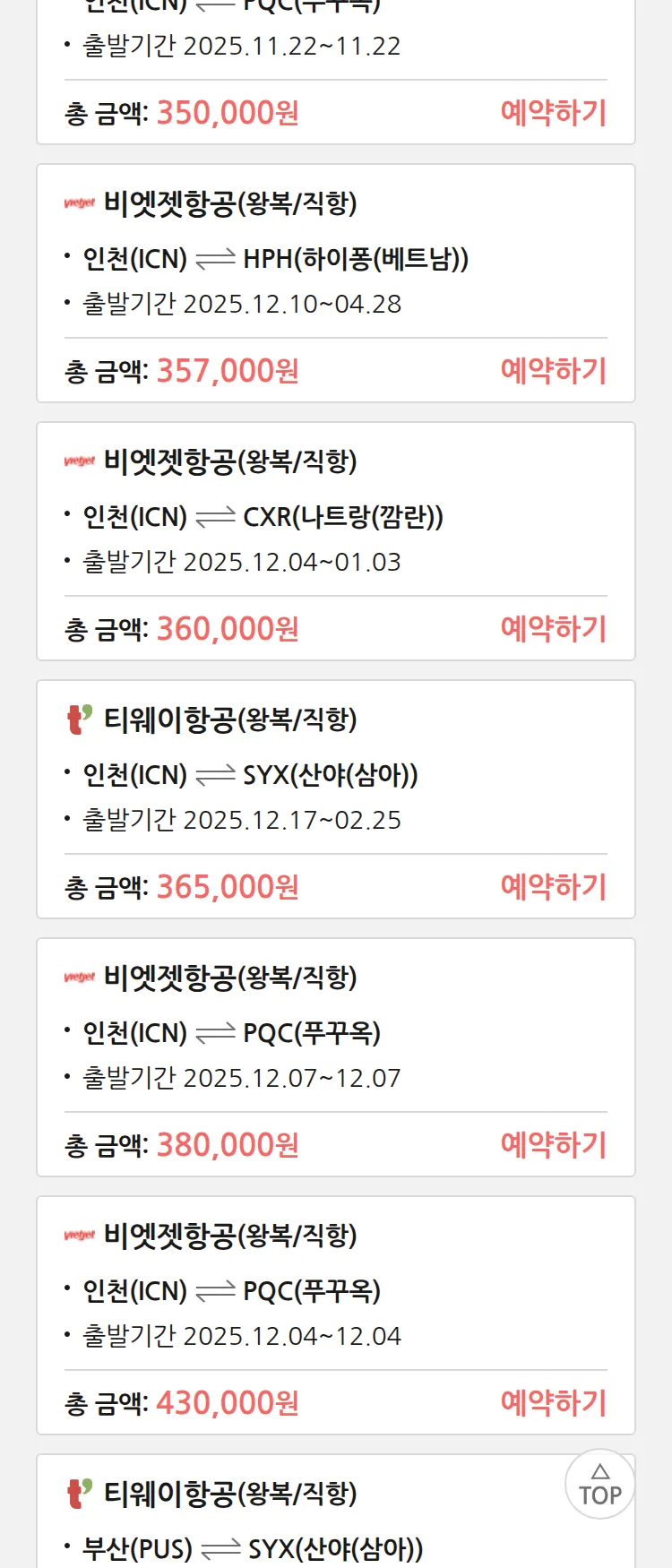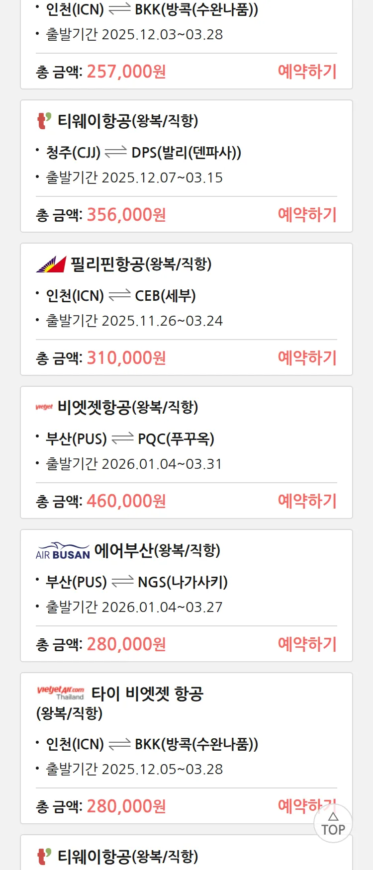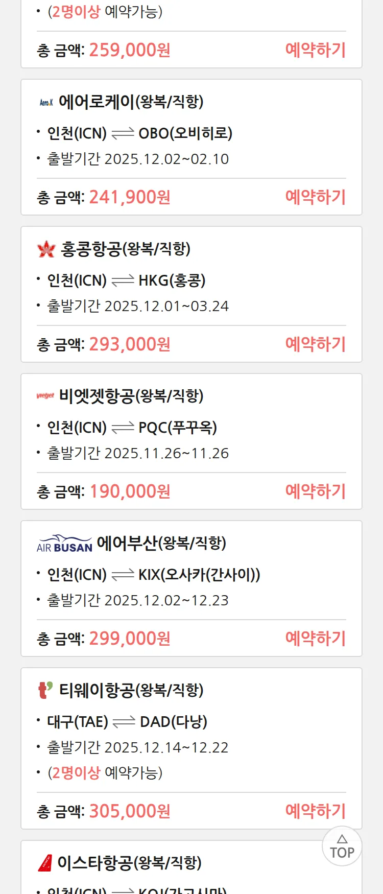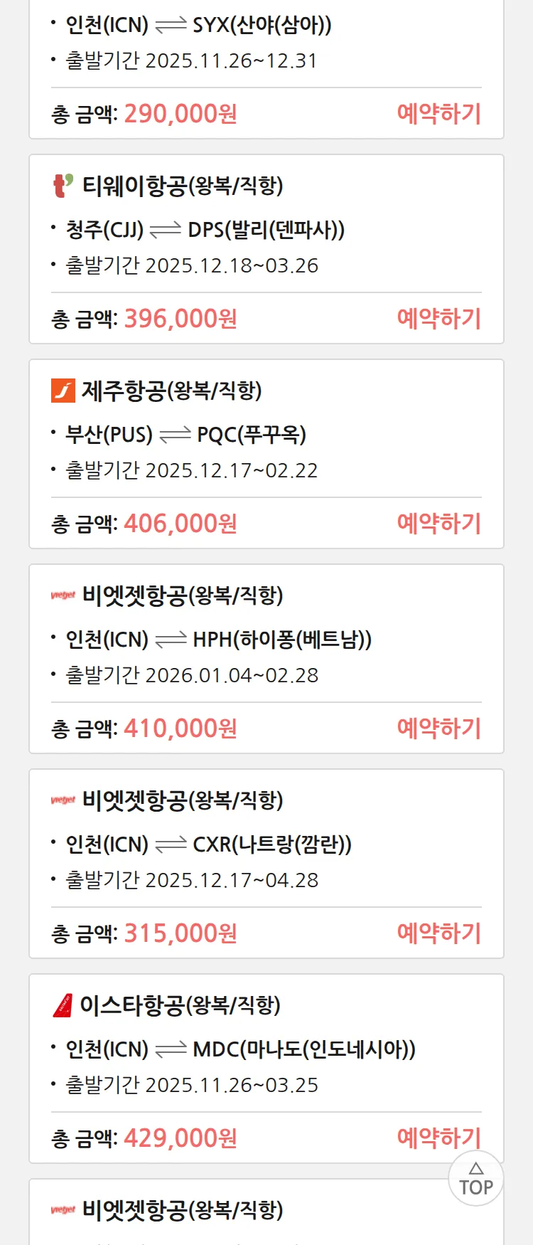 (11월 17일(월)) 땡처리 특가 항공권