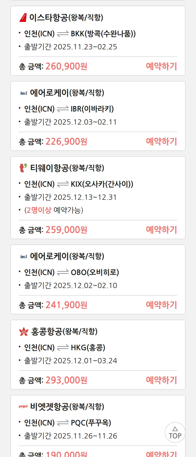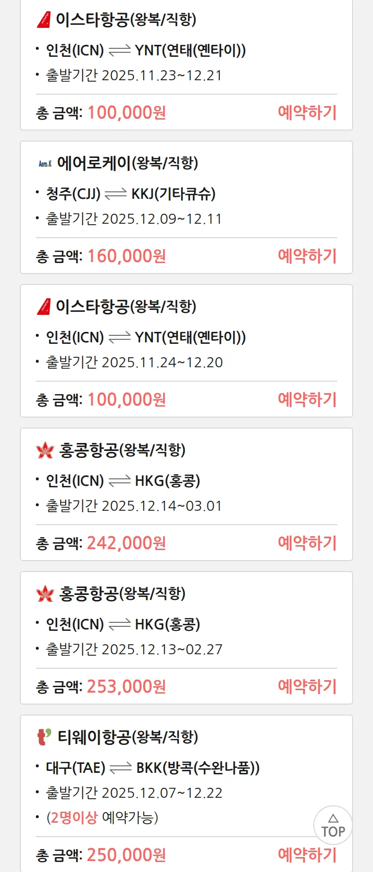 (11월 18일(화)) 땡처리 특가 항공권