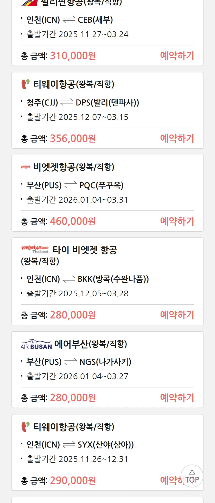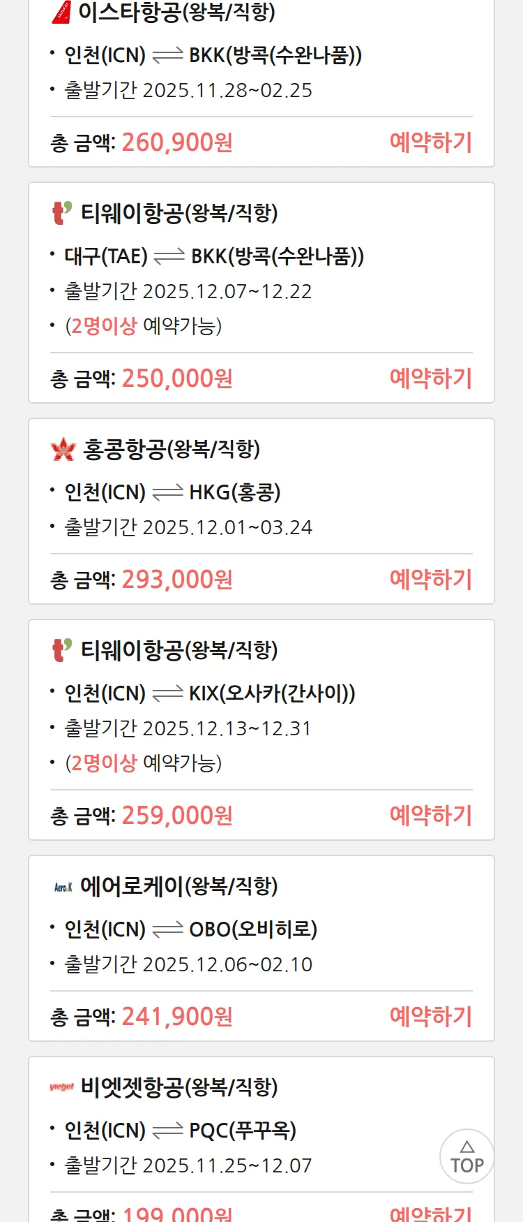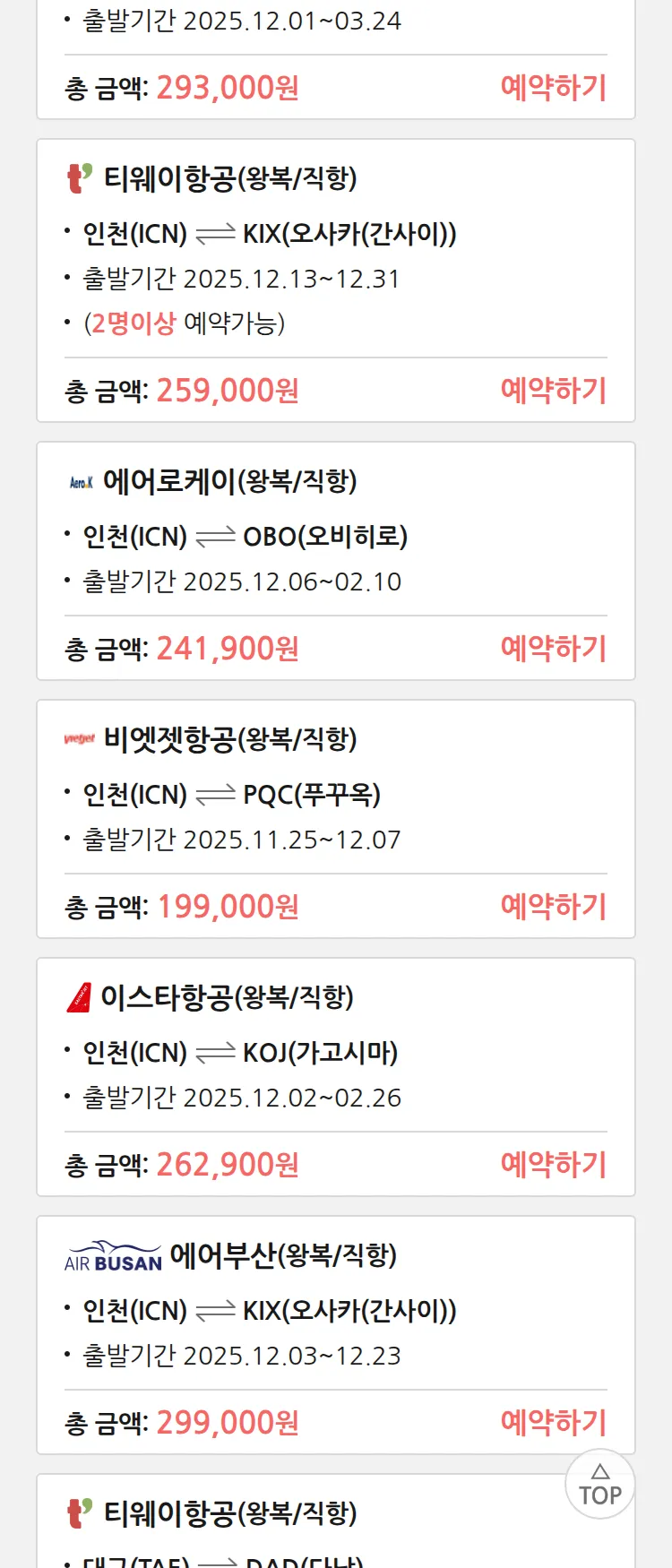 (11월 17일(월)) 땡처리 특가 항공권