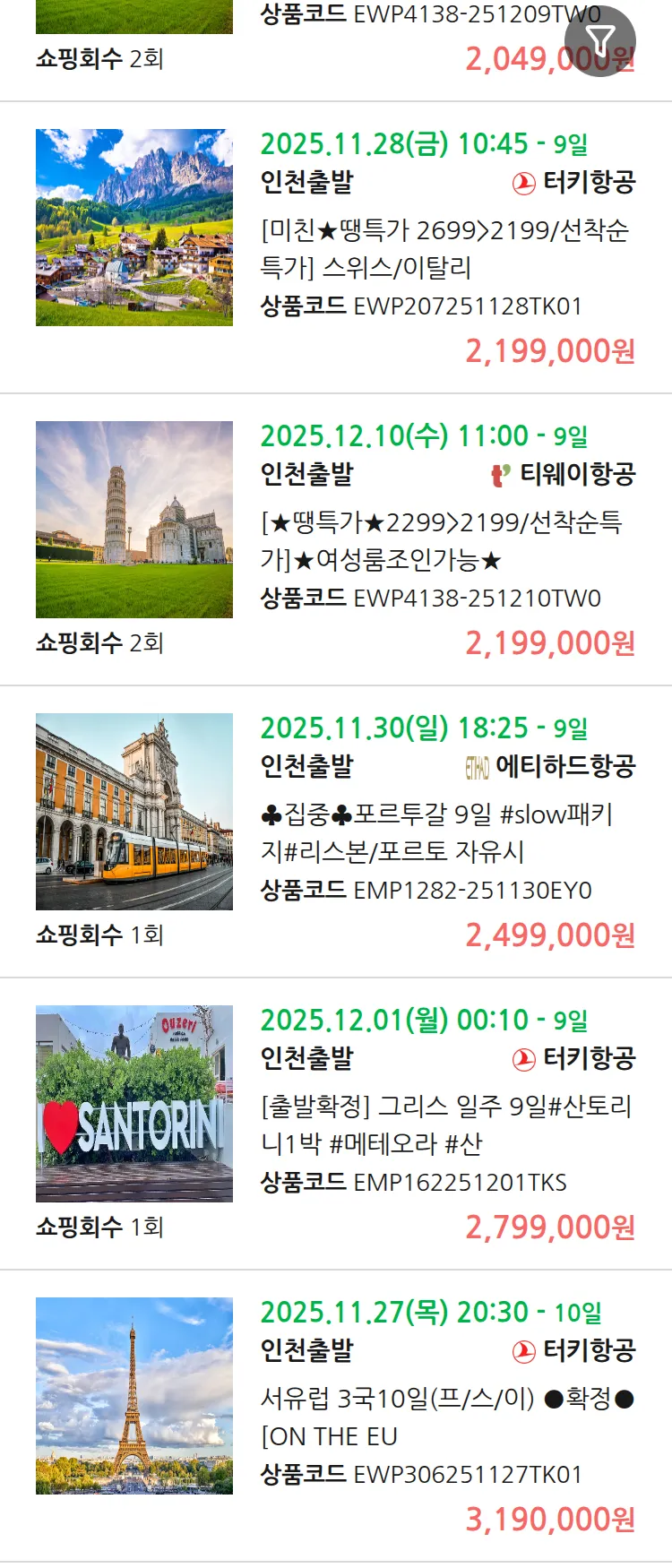 (11월 19일(수)) 땡처리 유럽 긴급 패키지