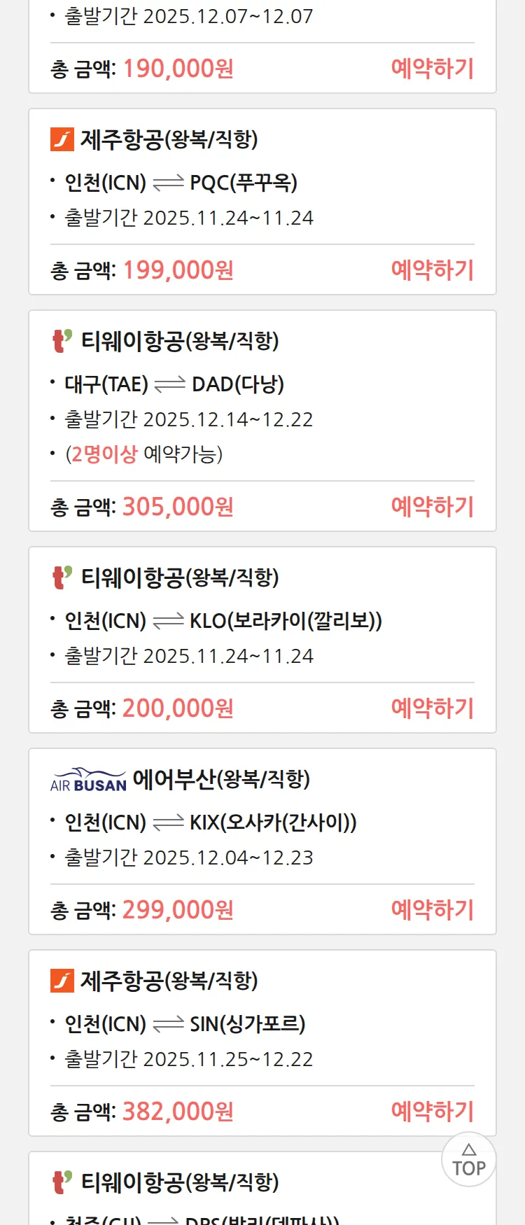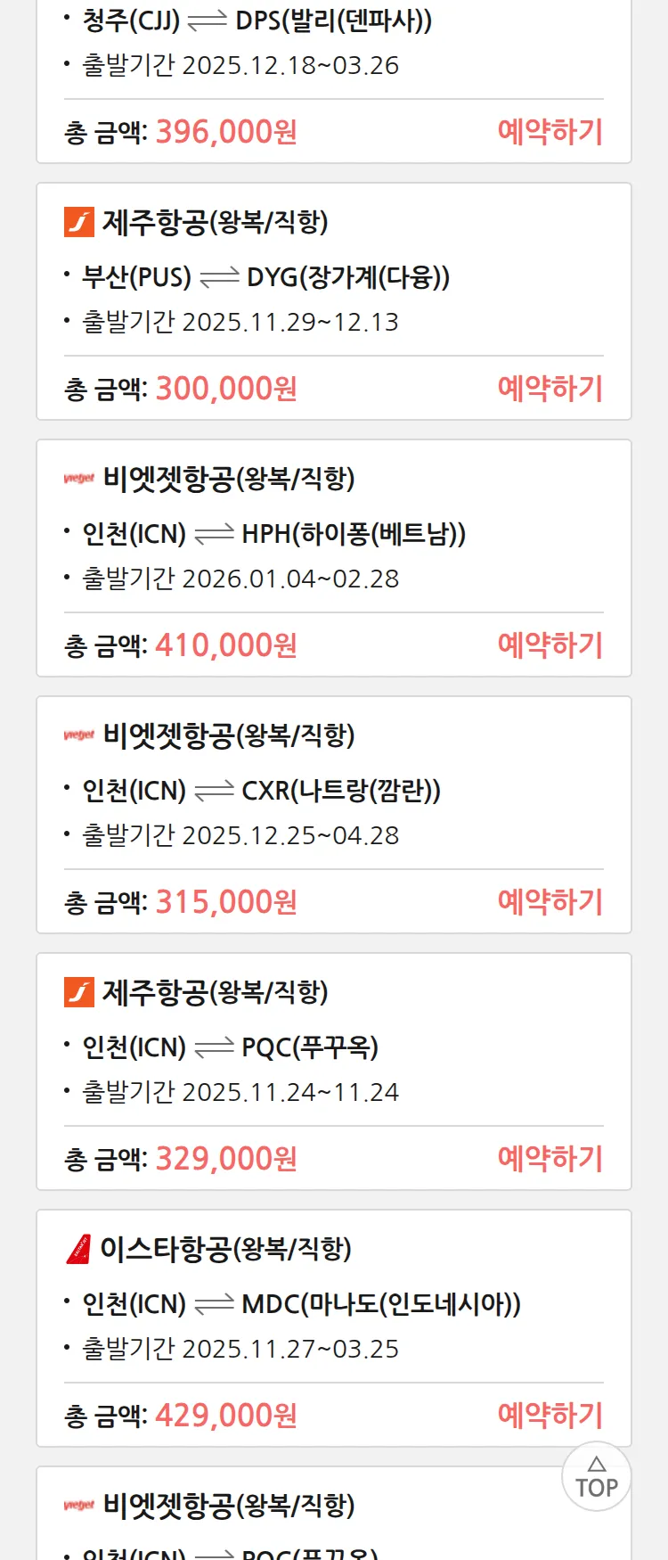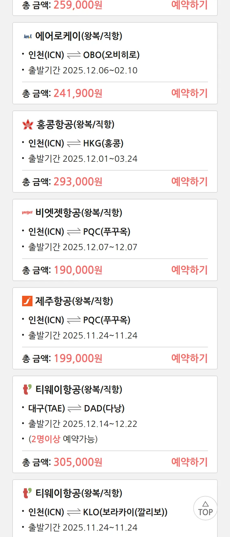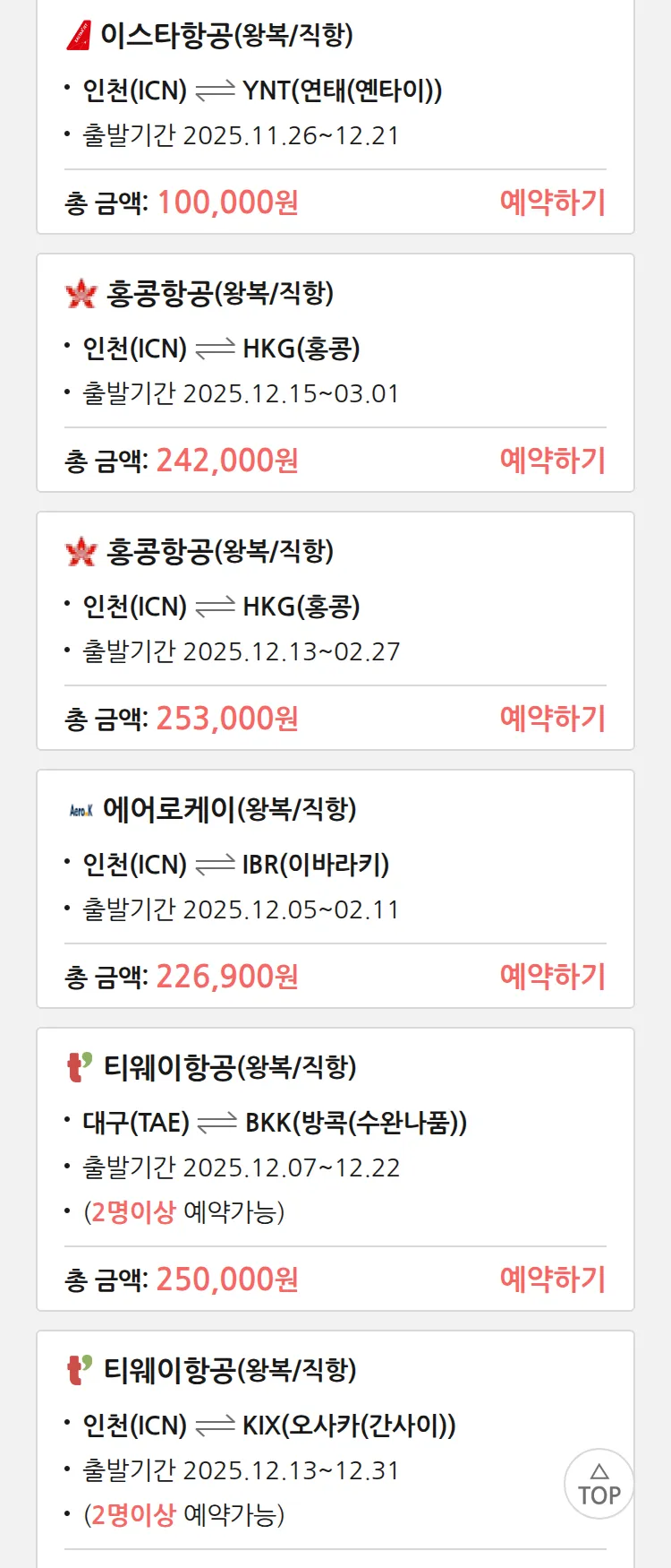 (11월 20일(목)) 땡처리 특가 항공권