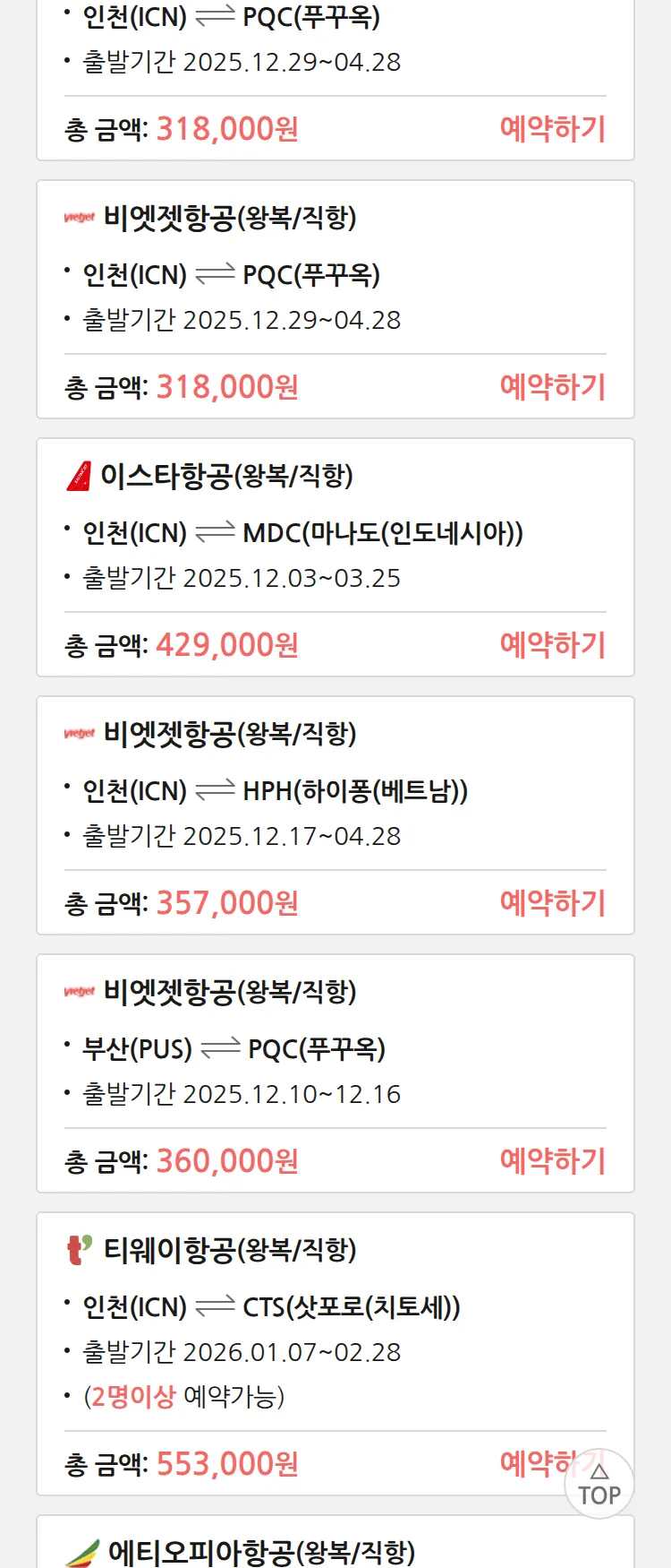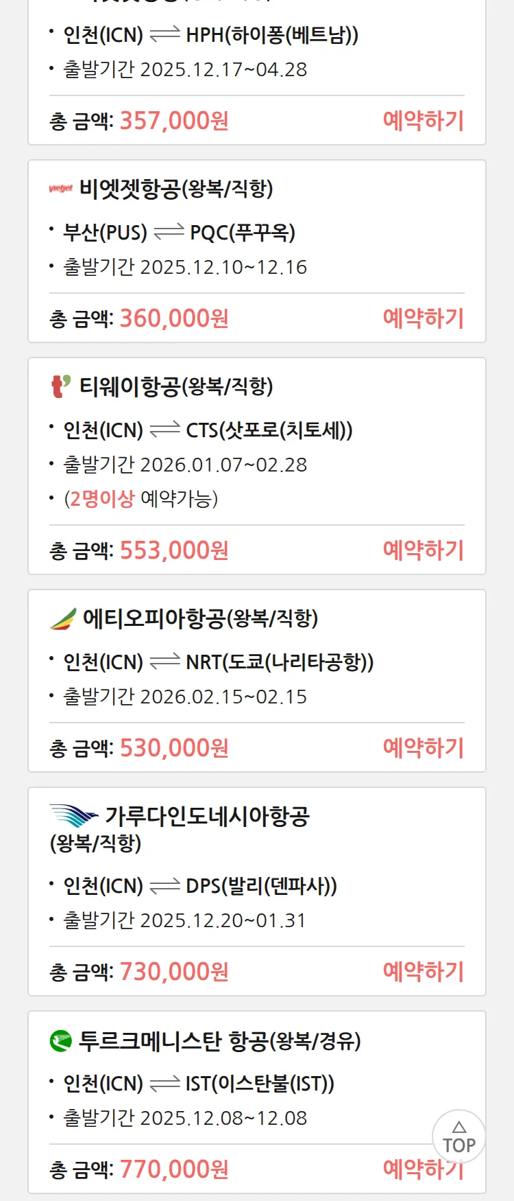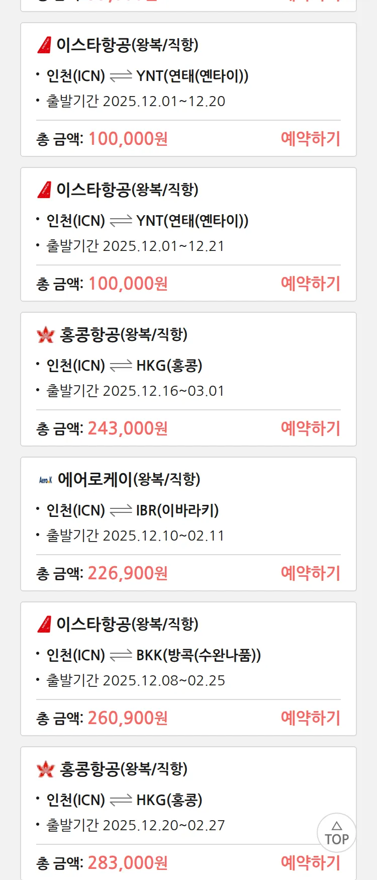 (11월 25일(화)) 땡처리 특가 항공권