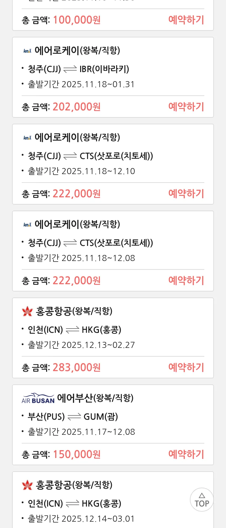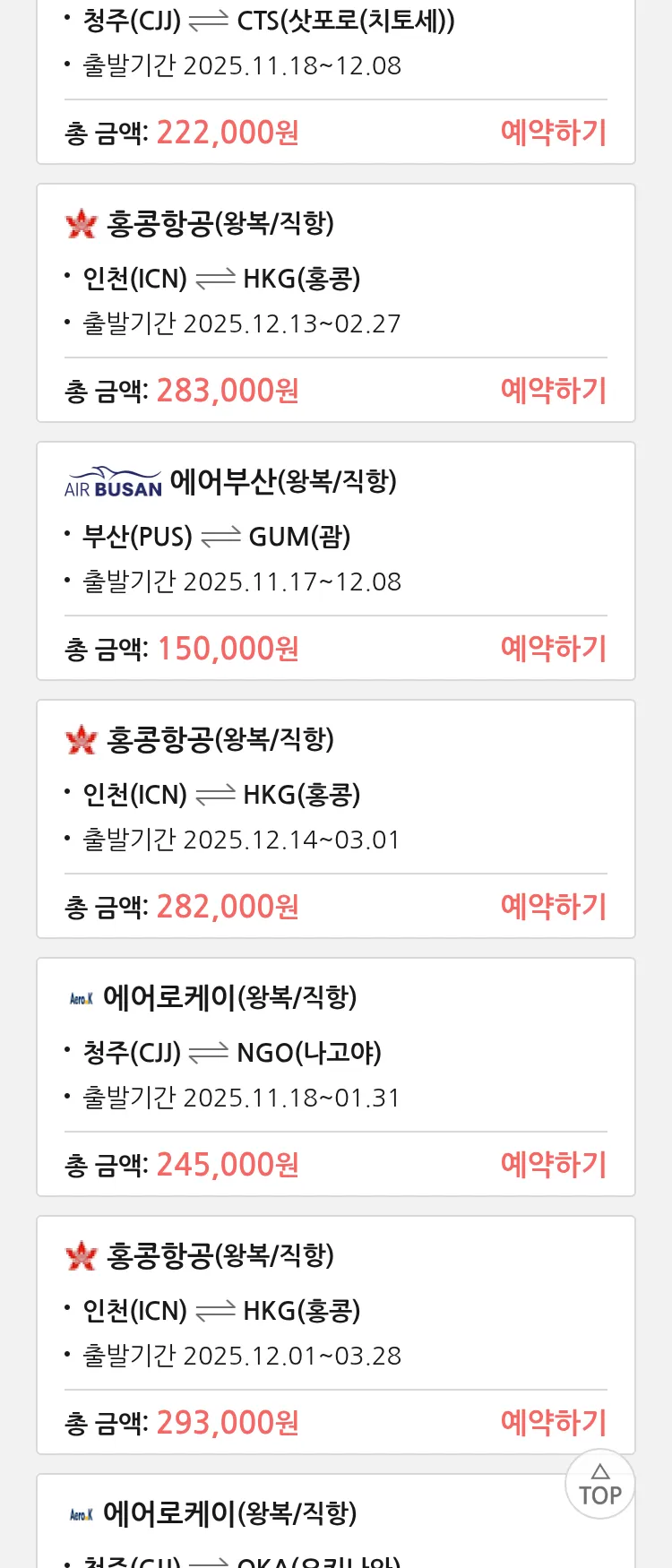 (11월2일(일)) 땡처리 특가 항공권