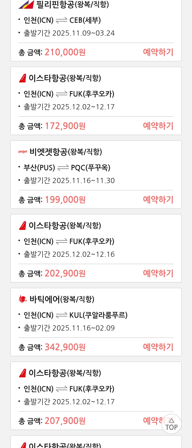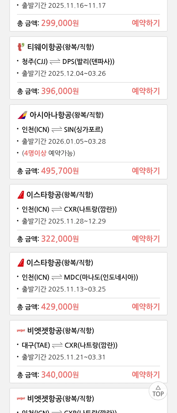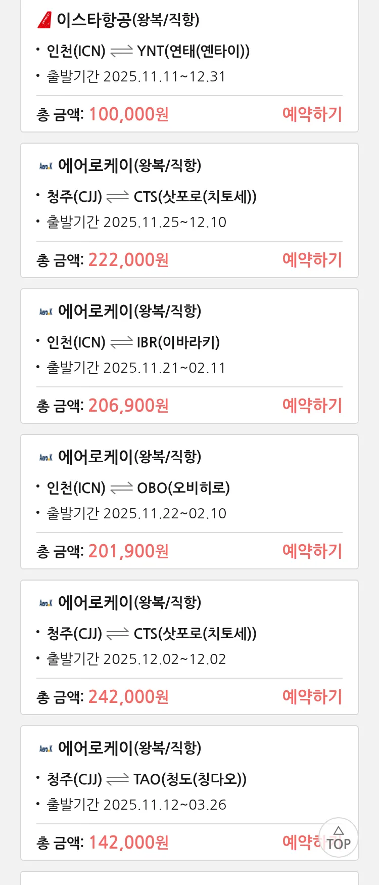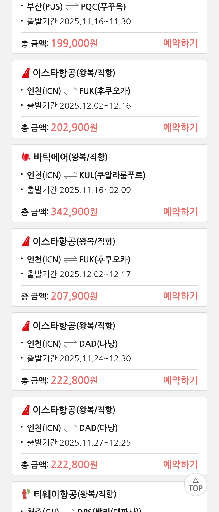 (11월6일(목)) 땡처리 특가 항공권