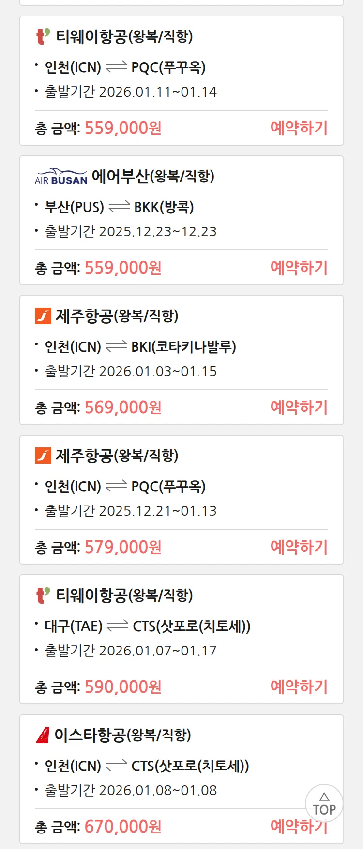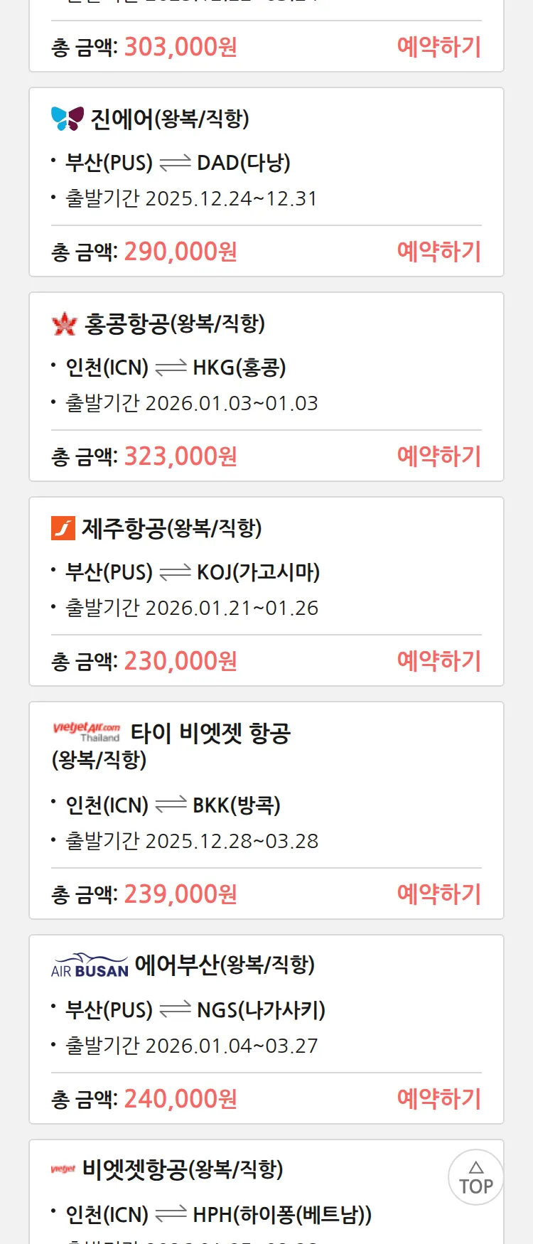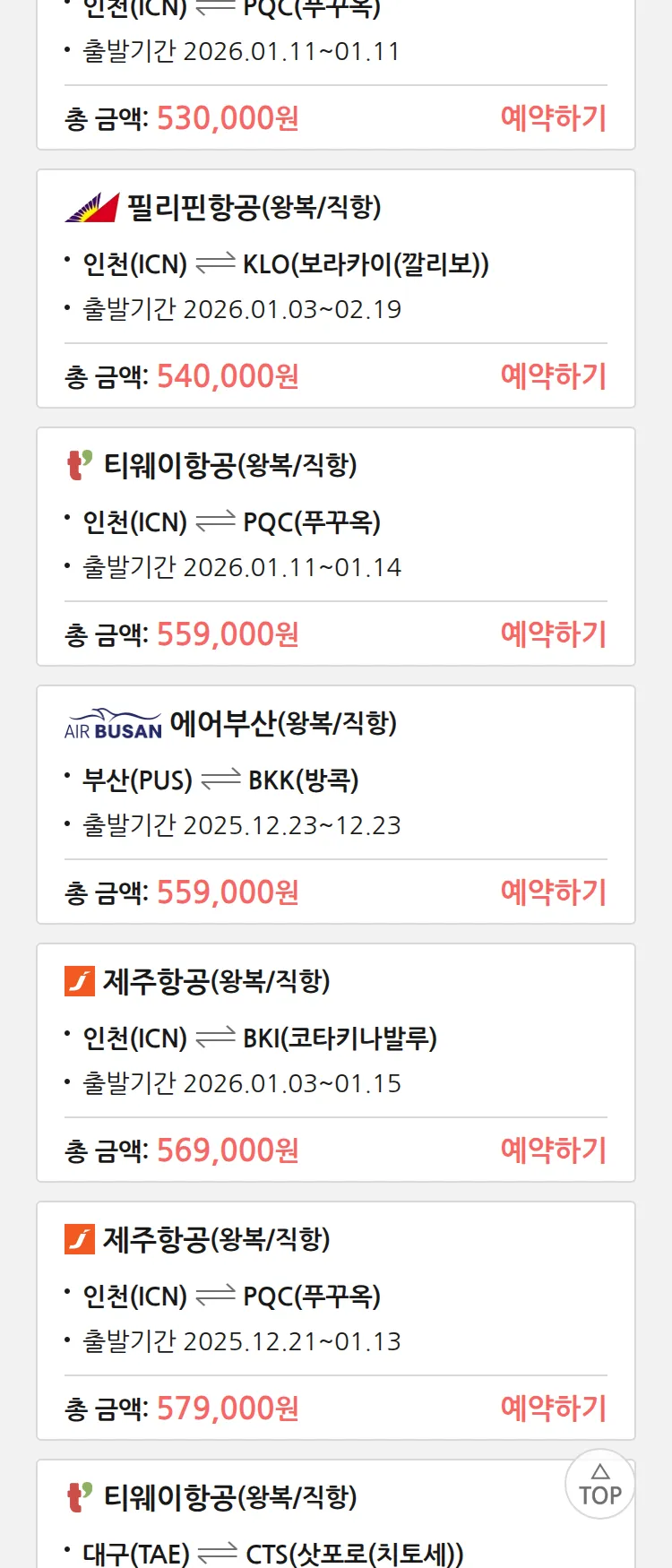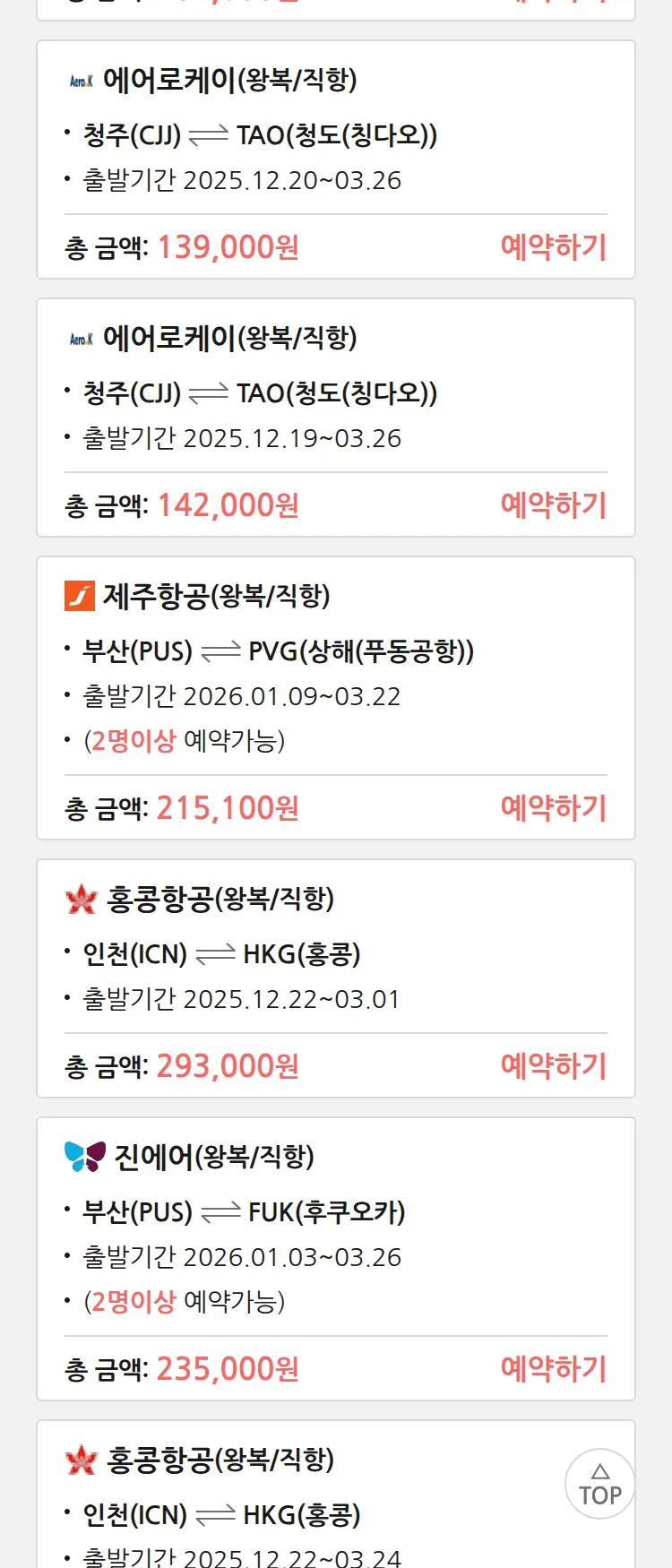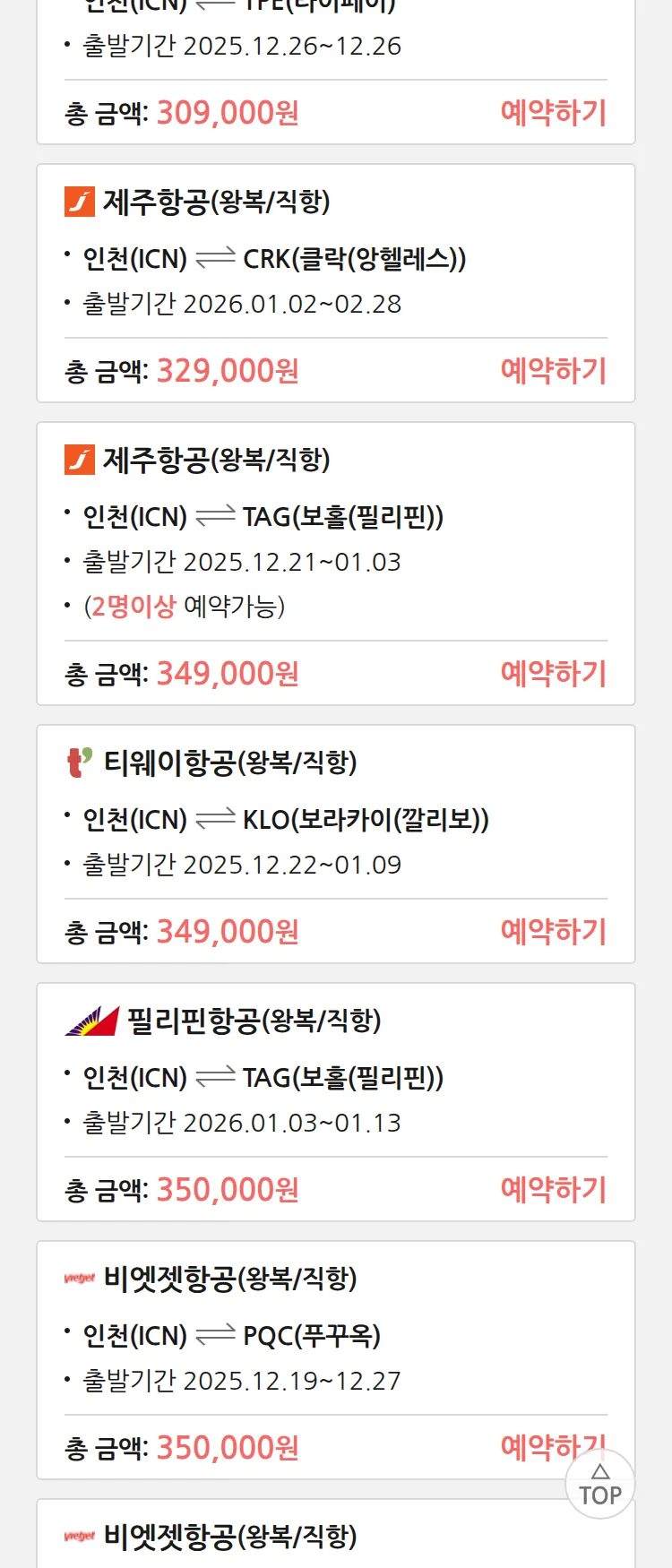 (12월 15일(월)) 땡처리 특가 항공권