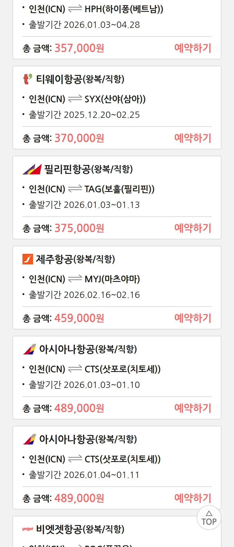 (12월 14일(일)) 땡처리 특가 항공권