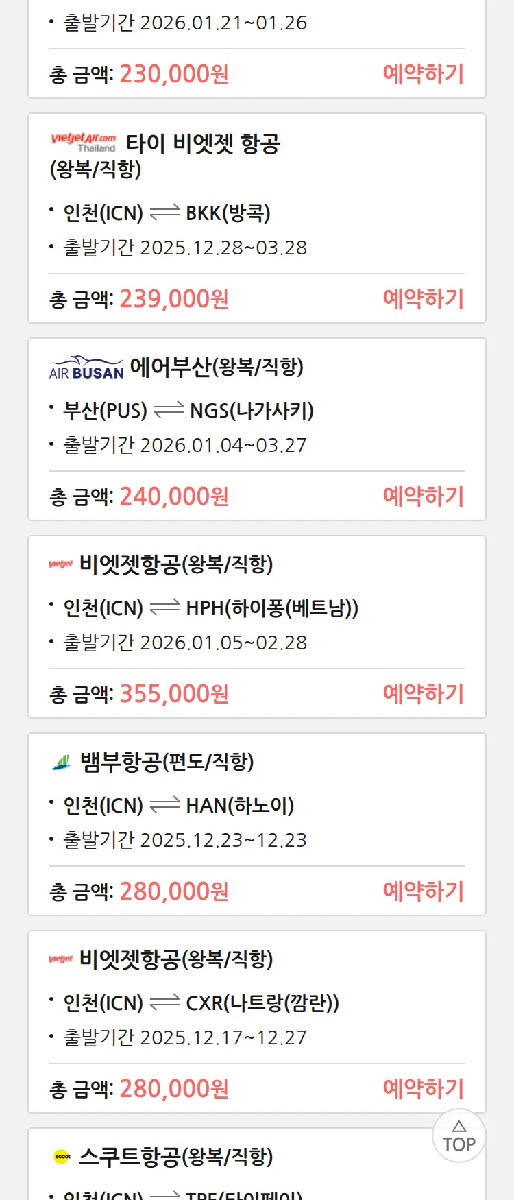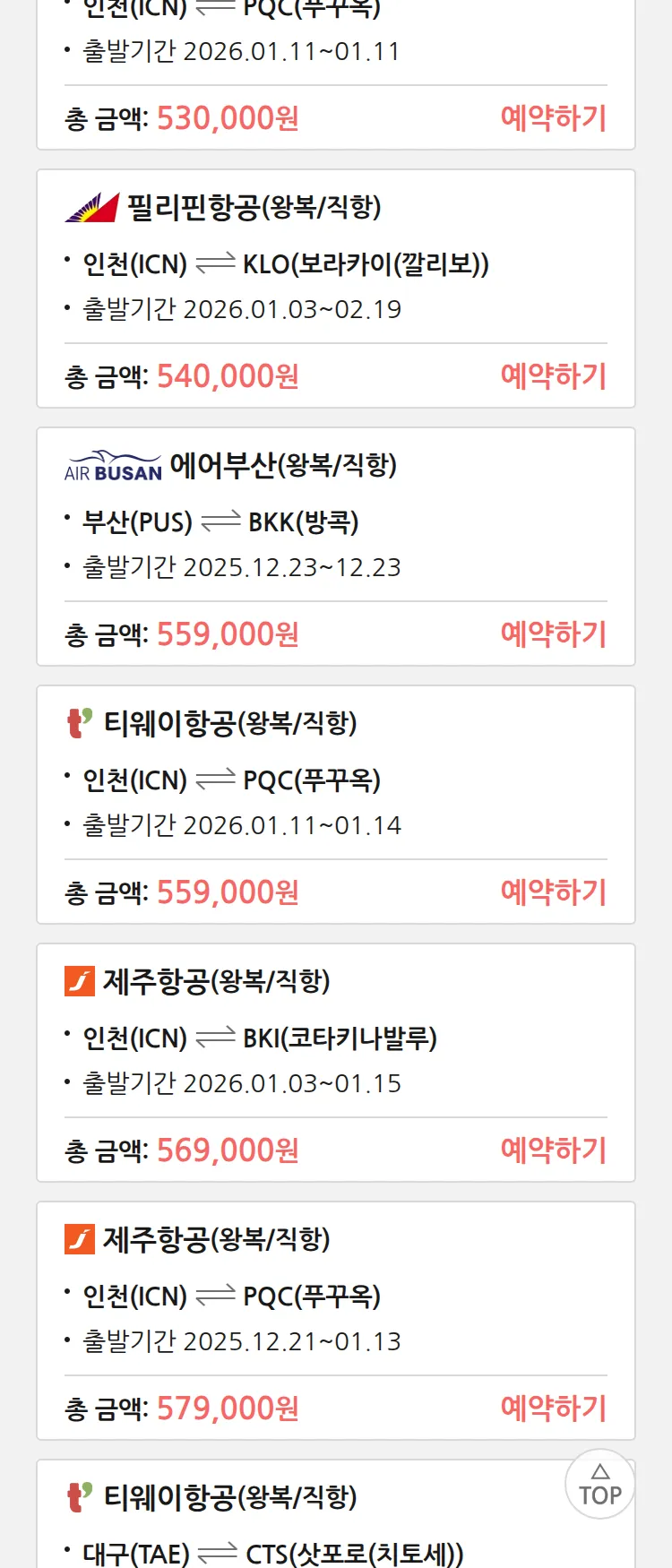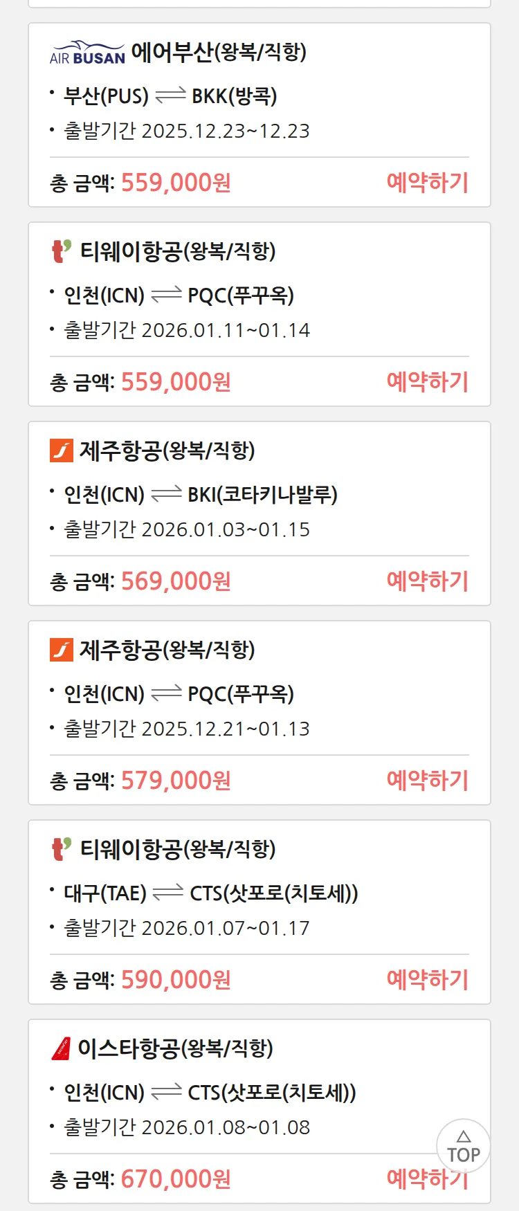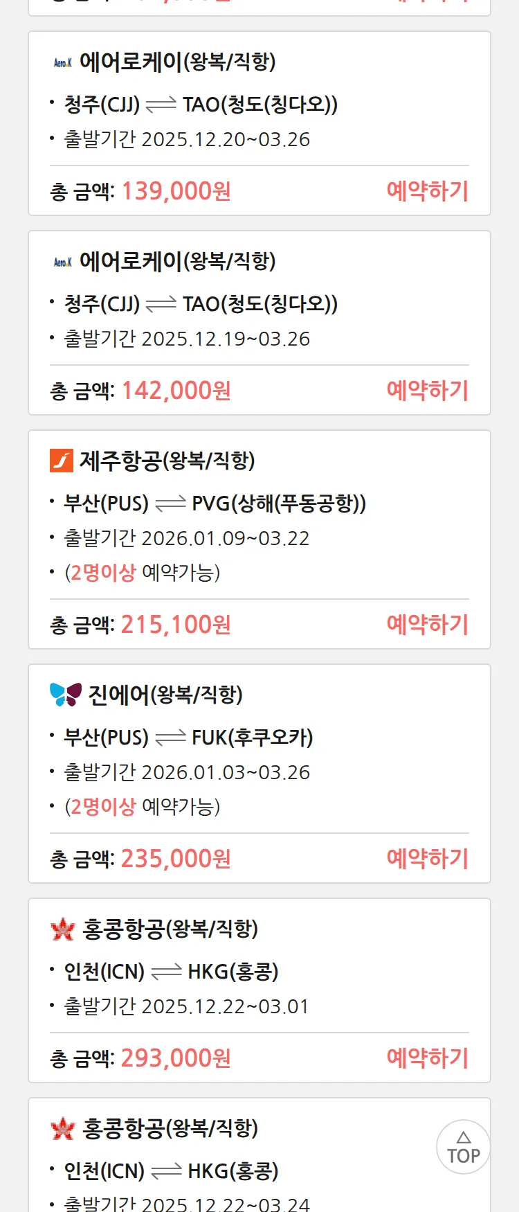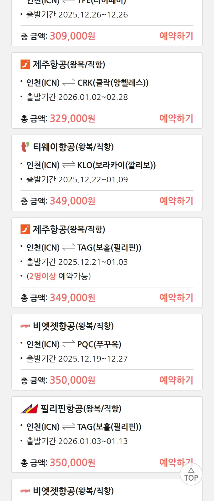 (12월 15일(월)) 땡처리 특가 항공권