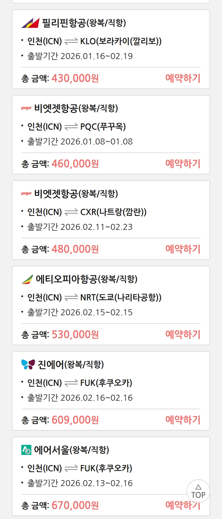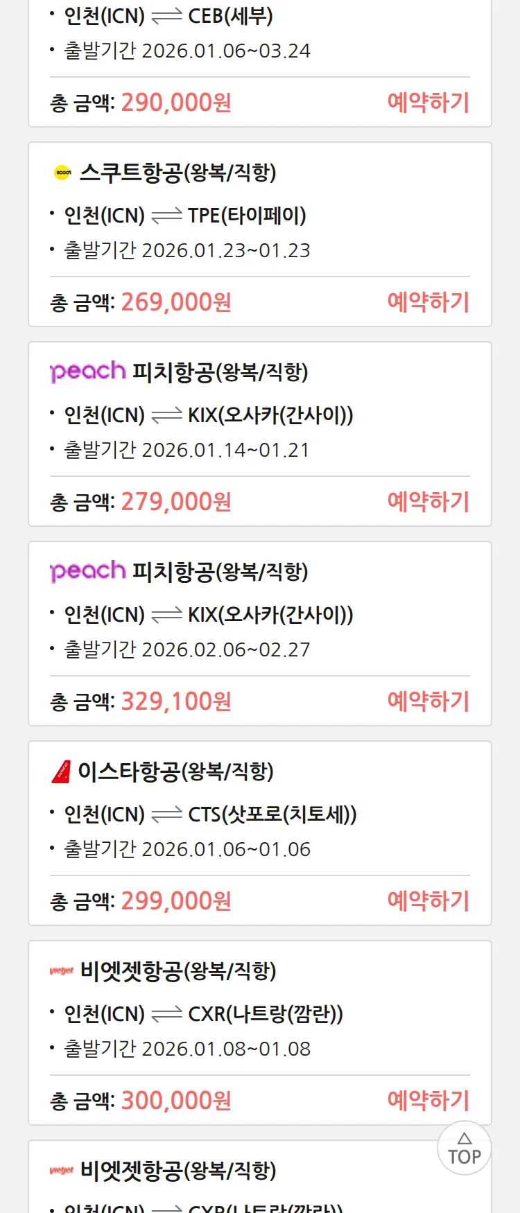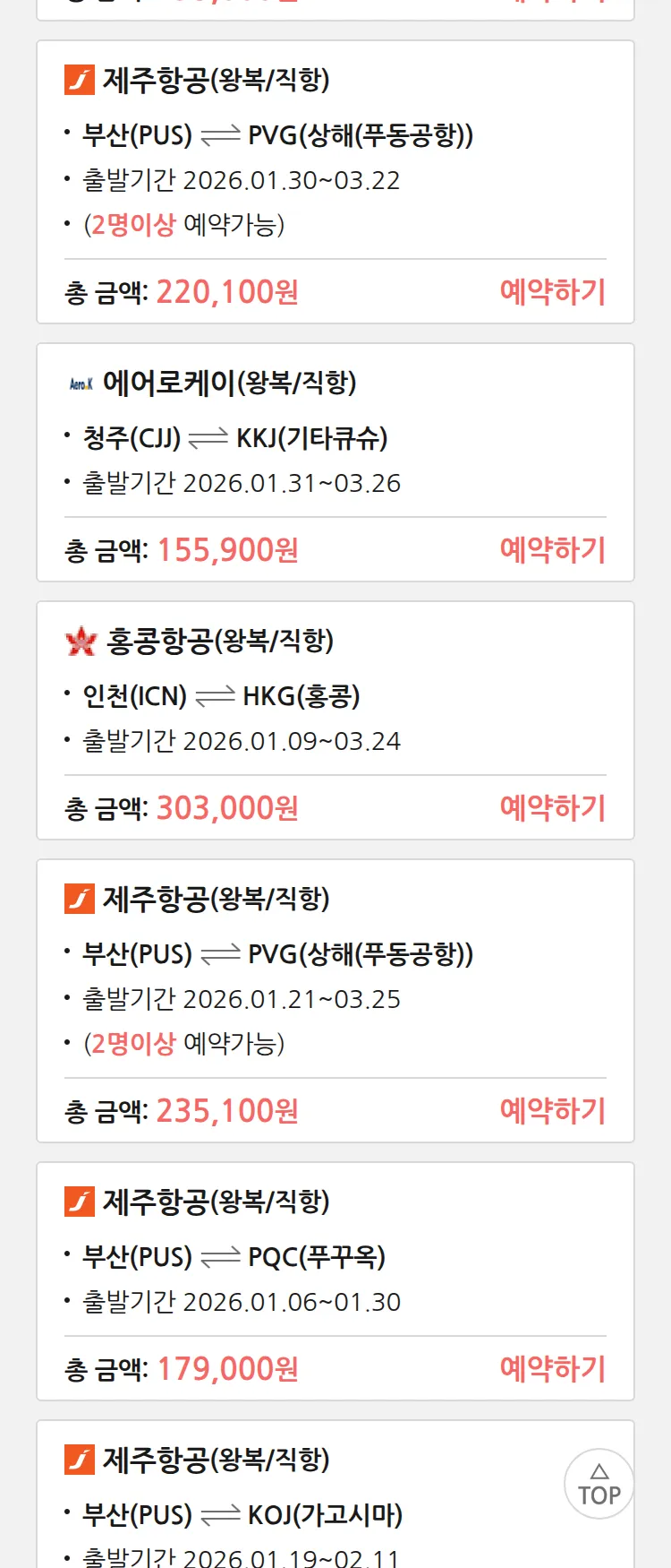 (12월 30일(화)) 땡처리 특가 항공권