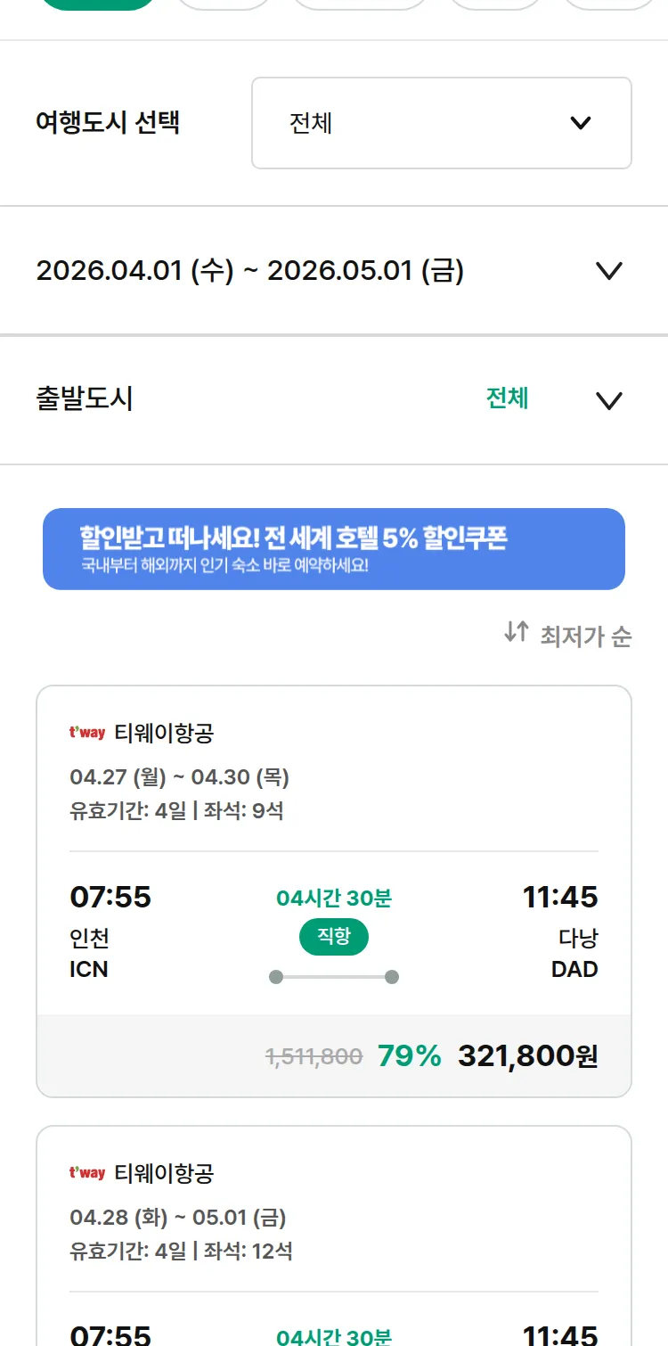 (3월 31일(화)) 모두투어 동남아 특가 항공권