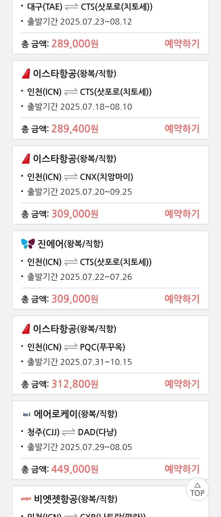 (7월 13일(일)) 땡처리 특가 항공권