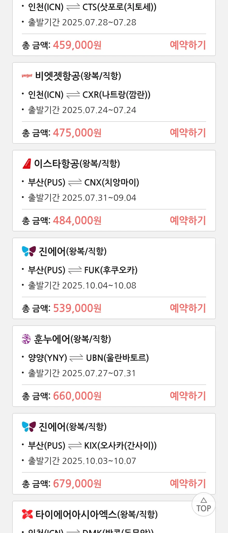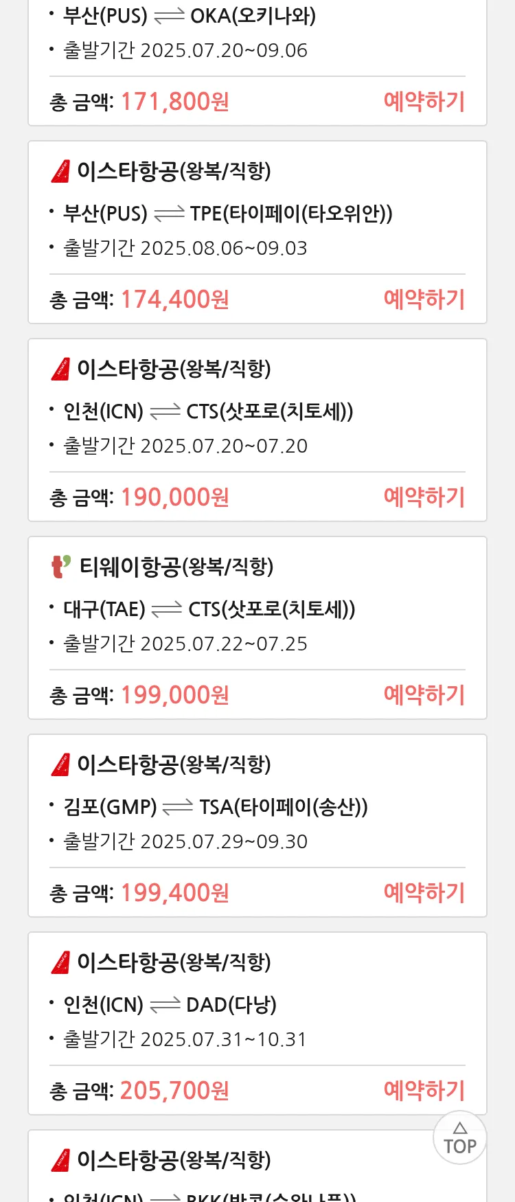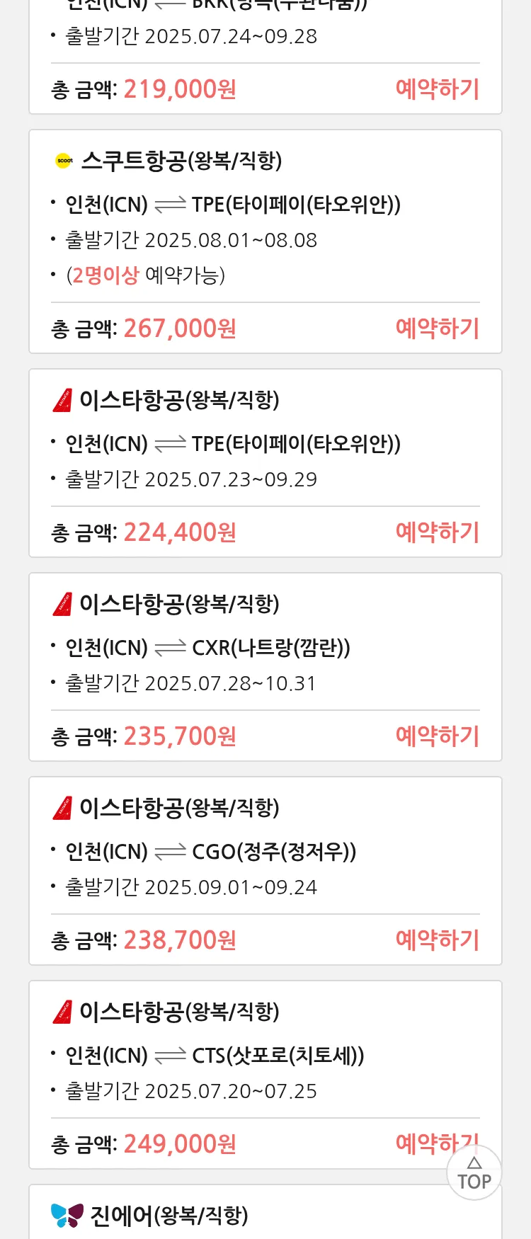 (7월 17일(목)) 땡처리 특가 항공권