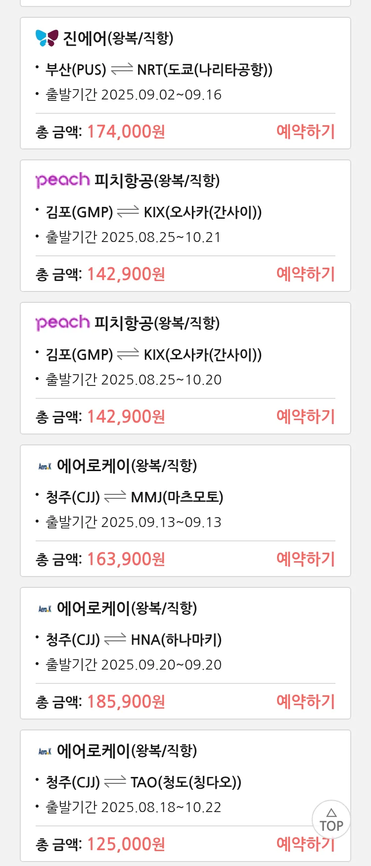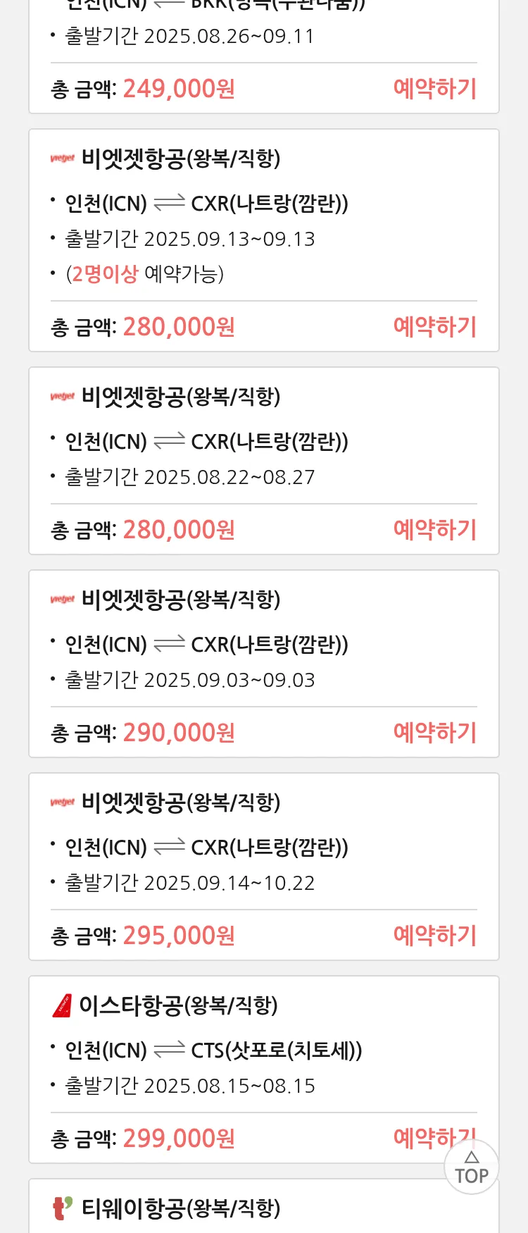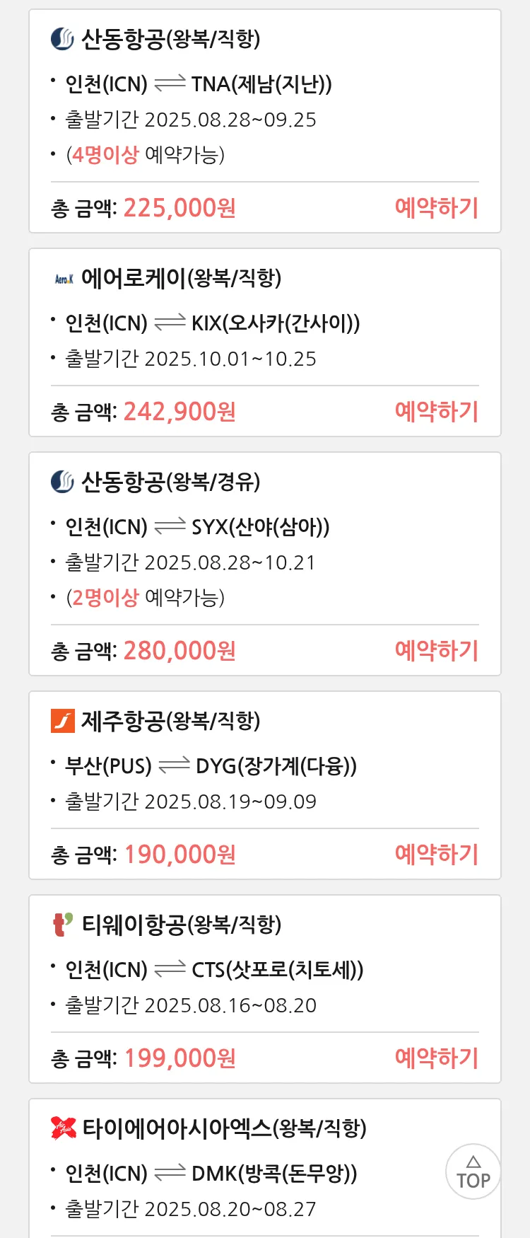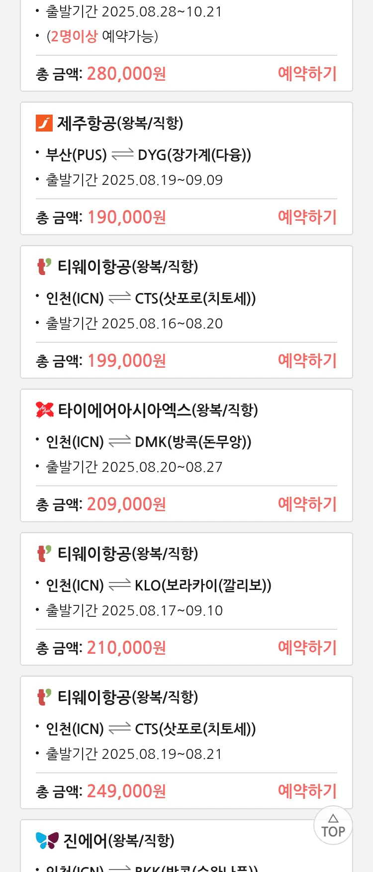 (8월 14일(목)) 땡처리 특가 항공권
