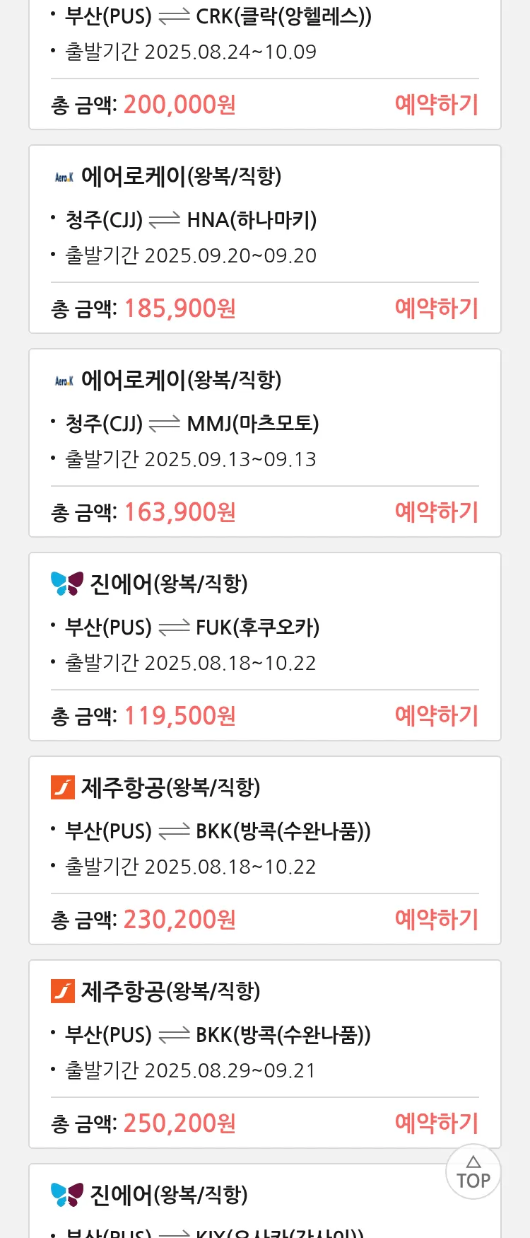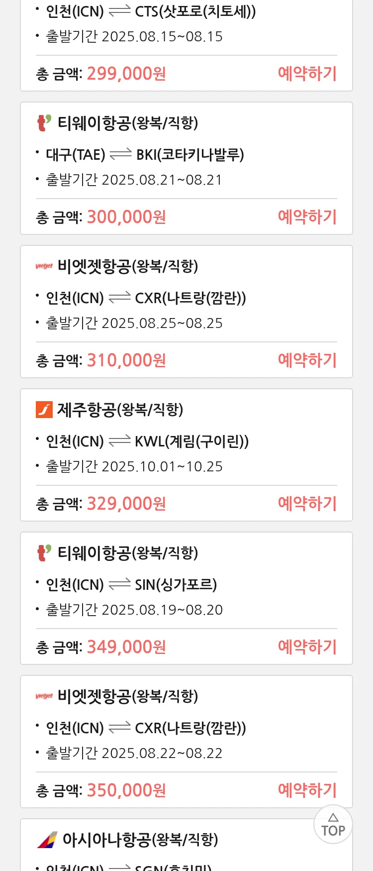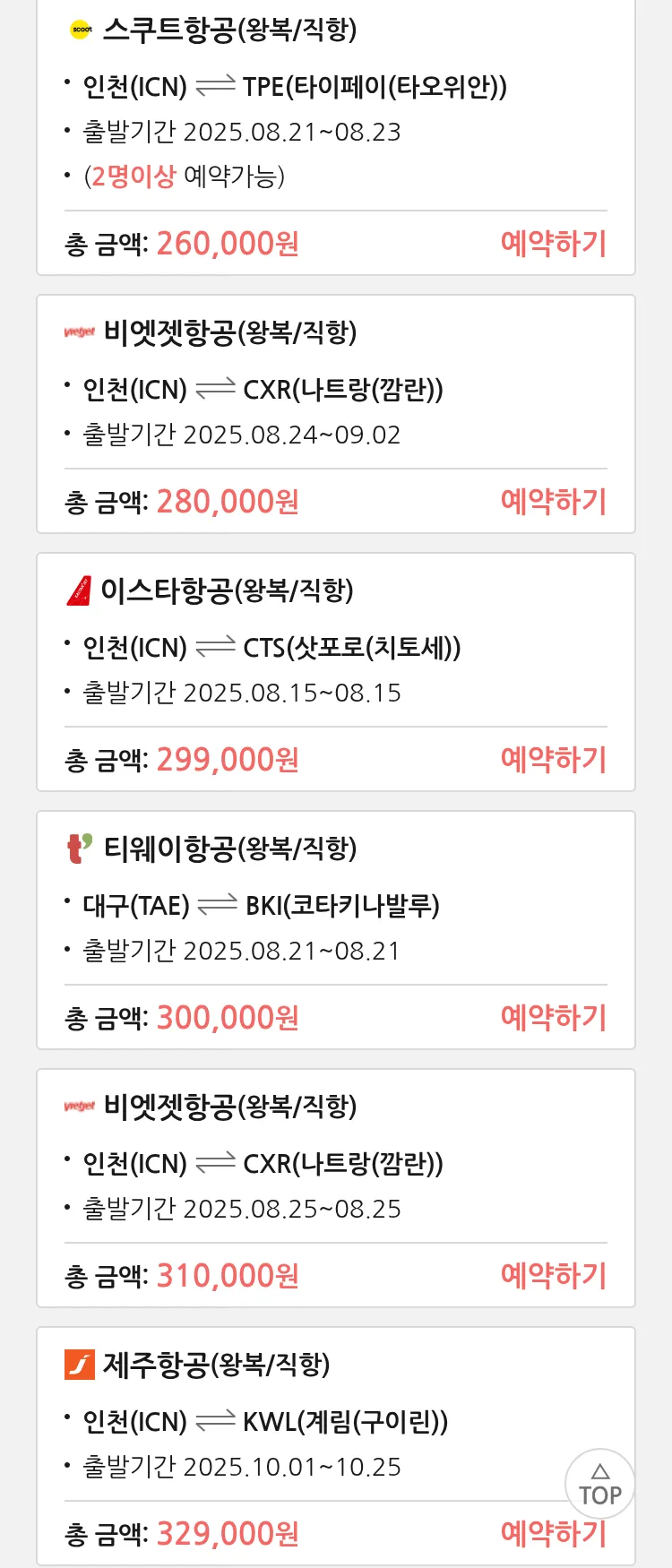 (8월 10일(일)) 땡처리 특가 항공권