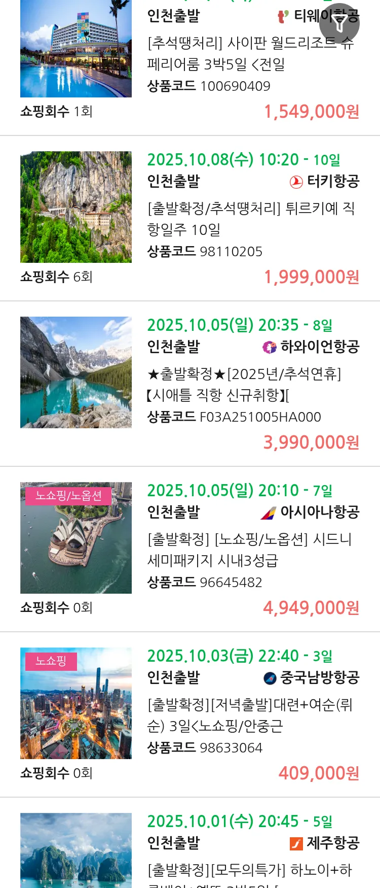 (9월9일(화)) 땡처리 연휴 패키지 항공권