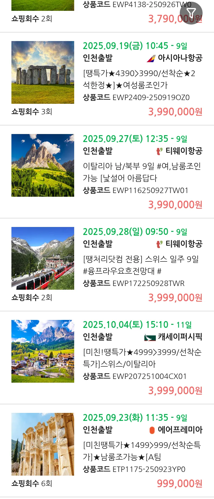 (9월 11일(목)) 땡처리 유럽 긴급 패키지