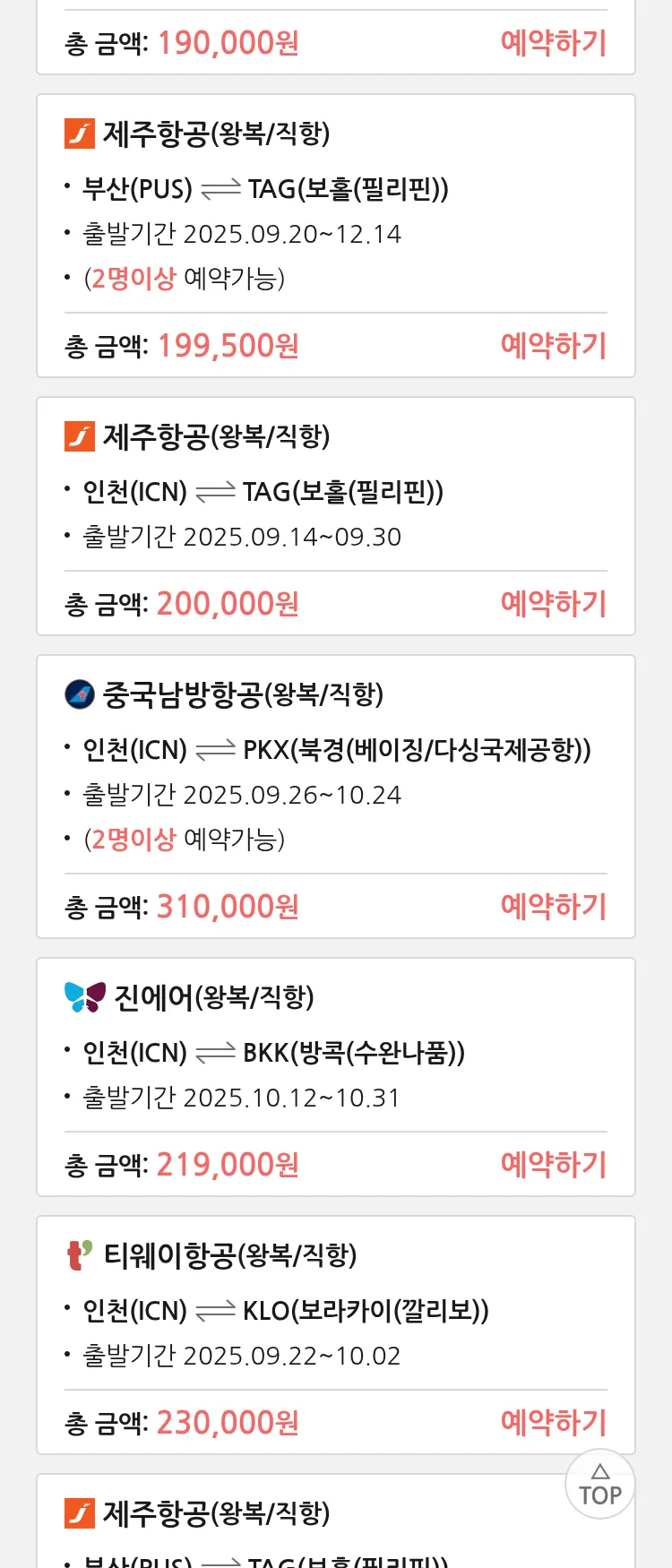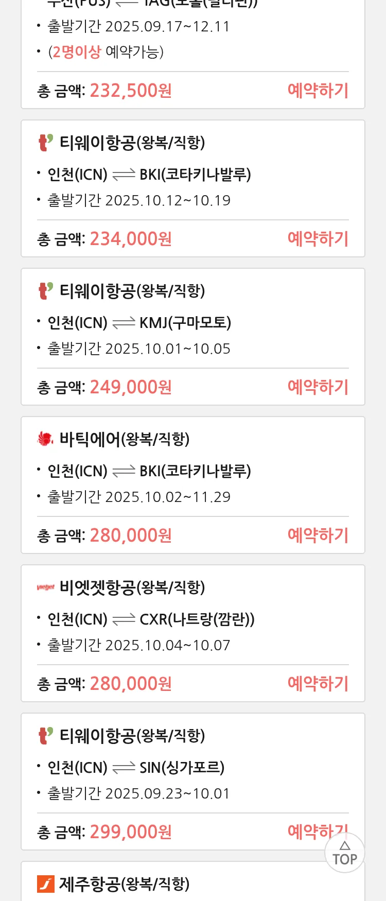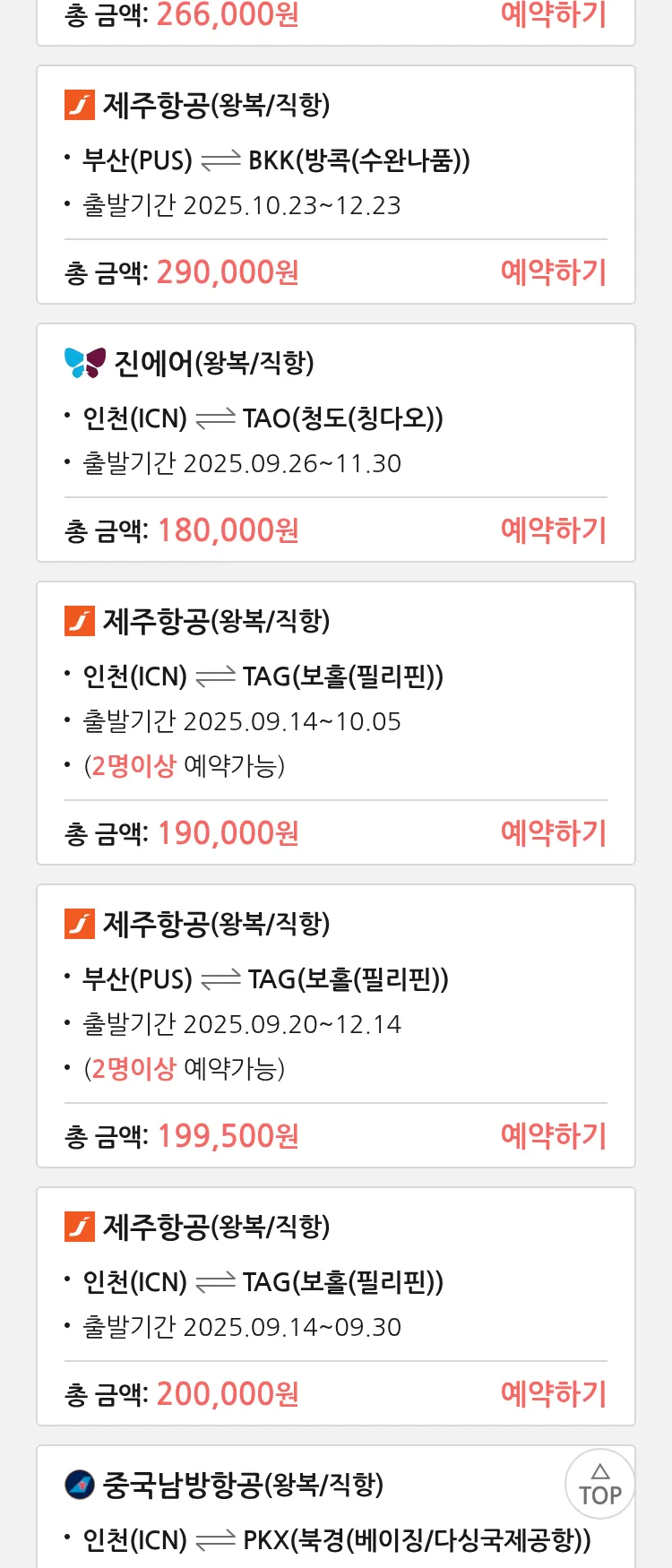 (9월 11일(목)) 땡처리 특가 항공권