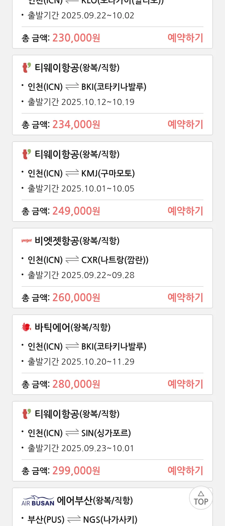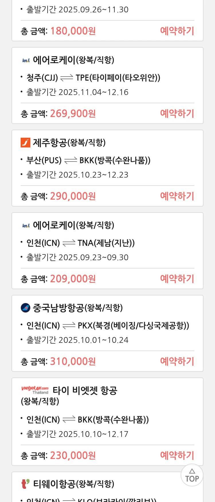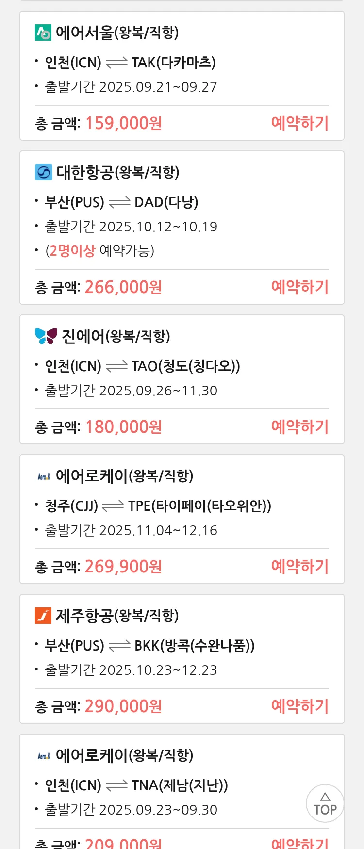 (9월 14일(일)) 땡처리 특가 항공권