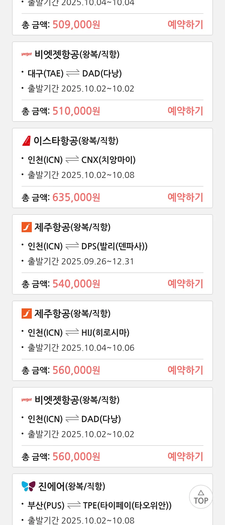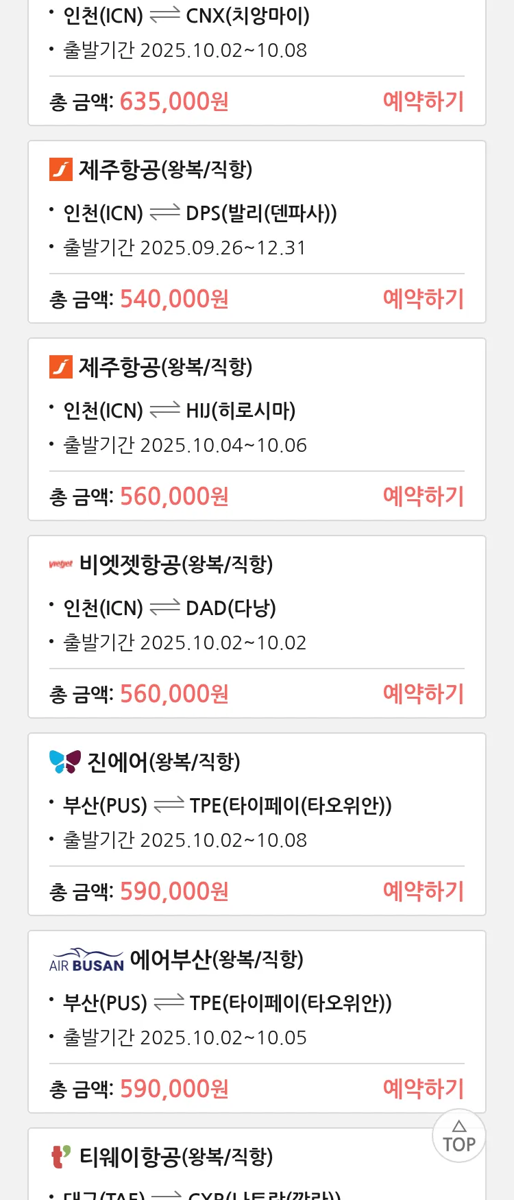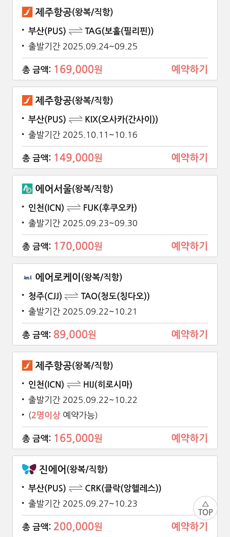 (9월 15일(월)) 땡처리 특가 항공권