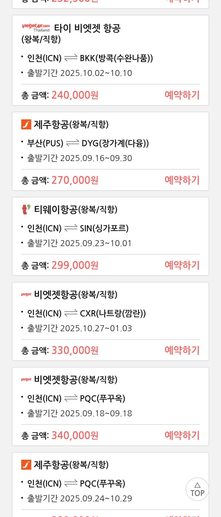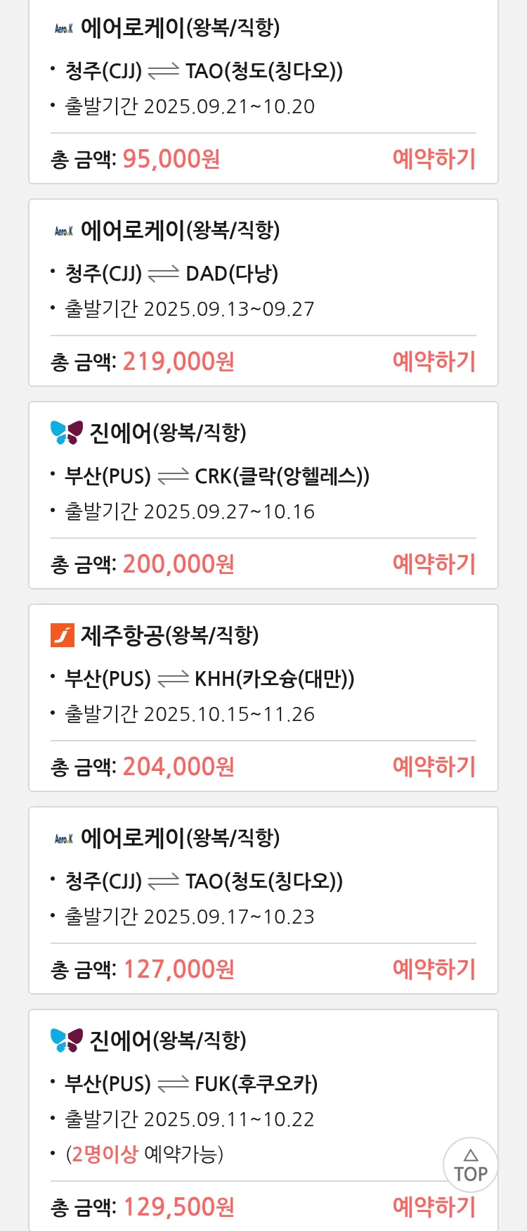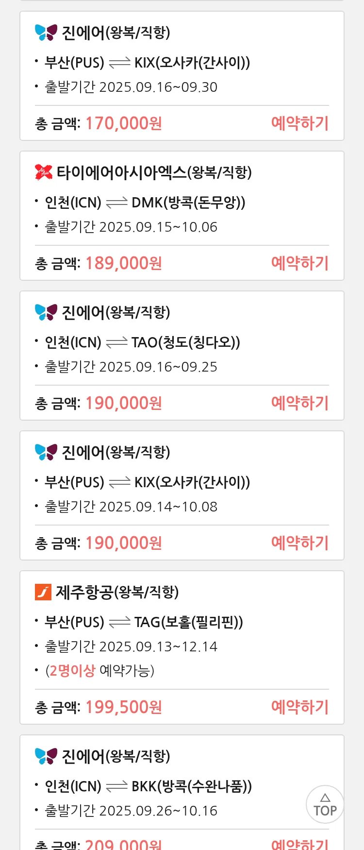 (9월8일(월)) 땡처리 99.9% 확정 항공권