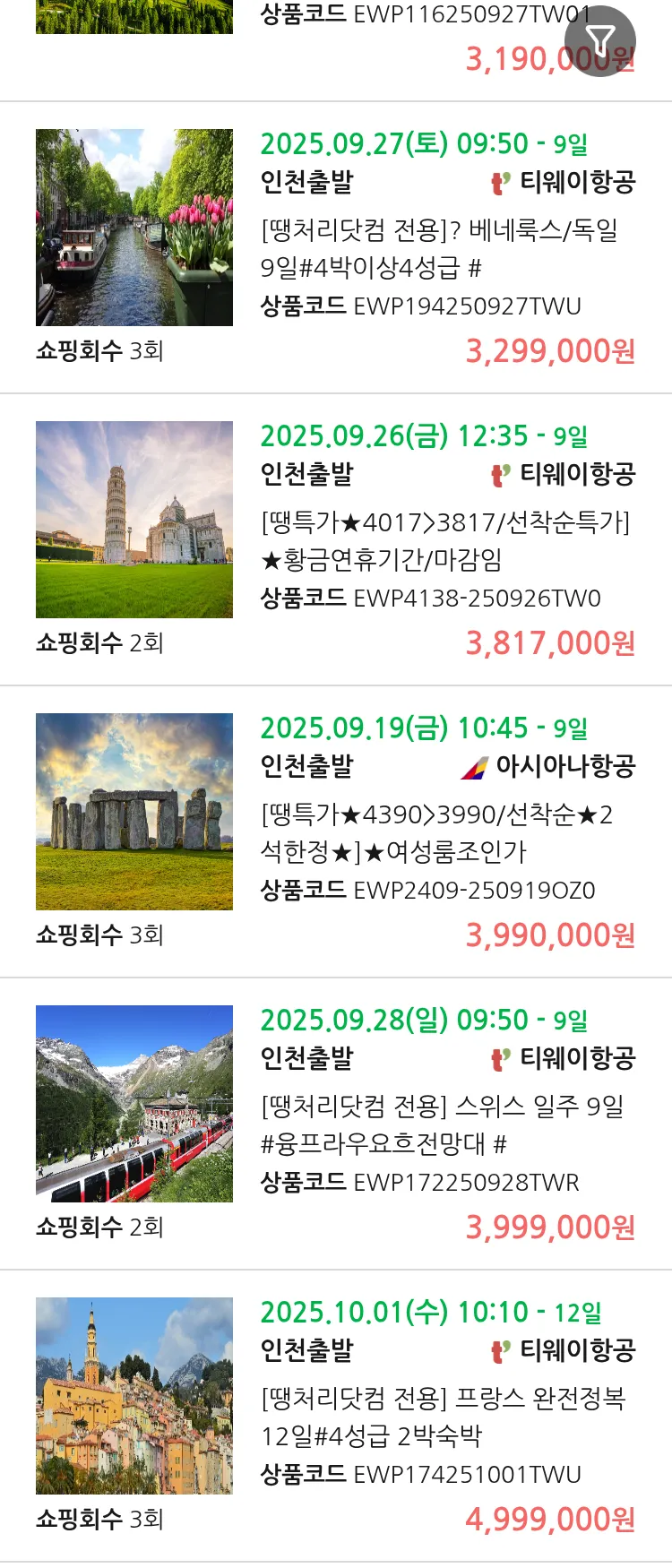 (9월8일(월)) 땡처리 유럽 긴급 항공권