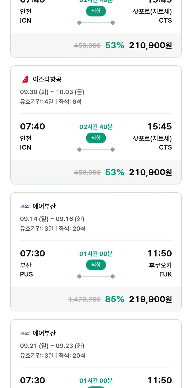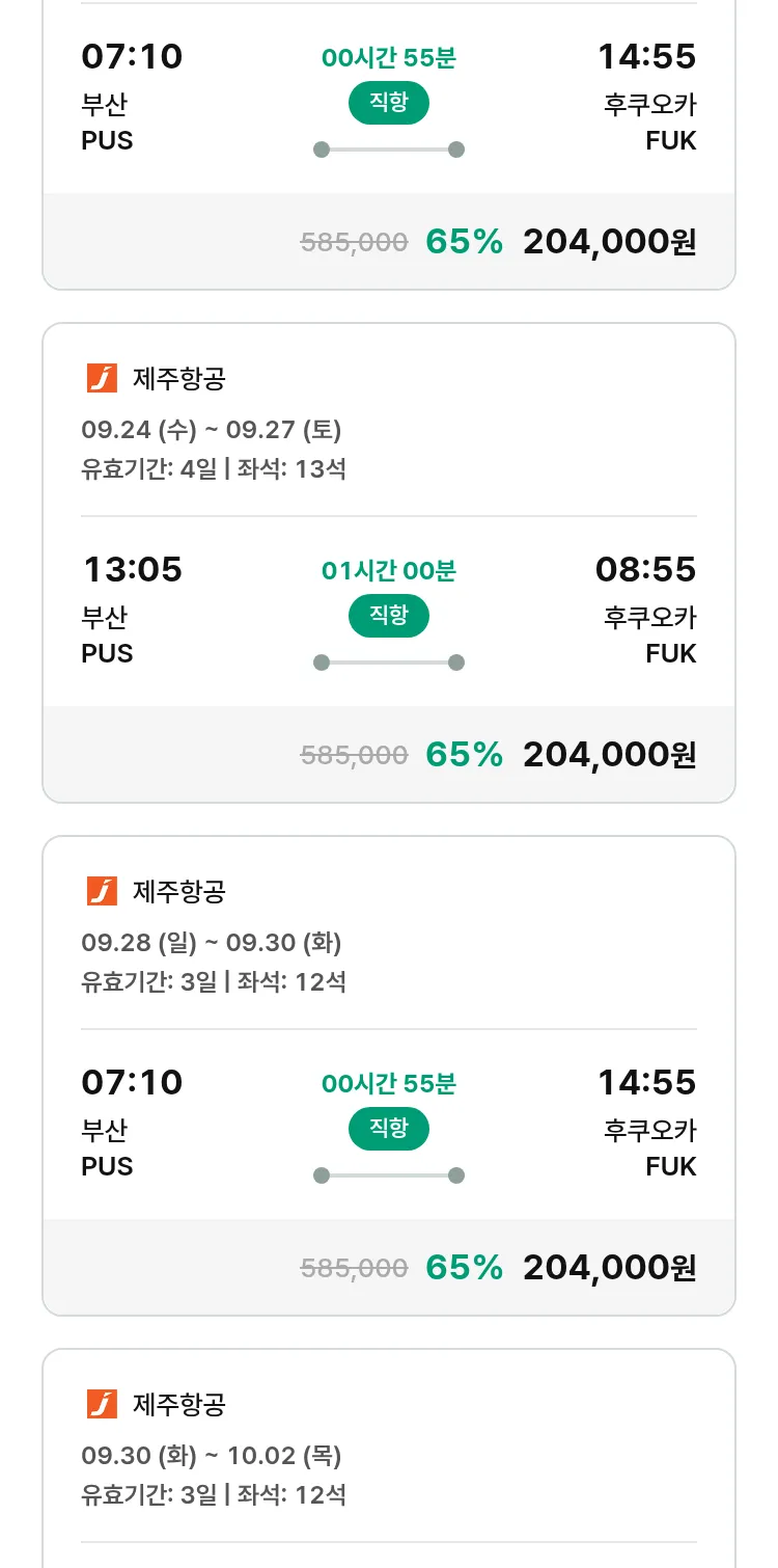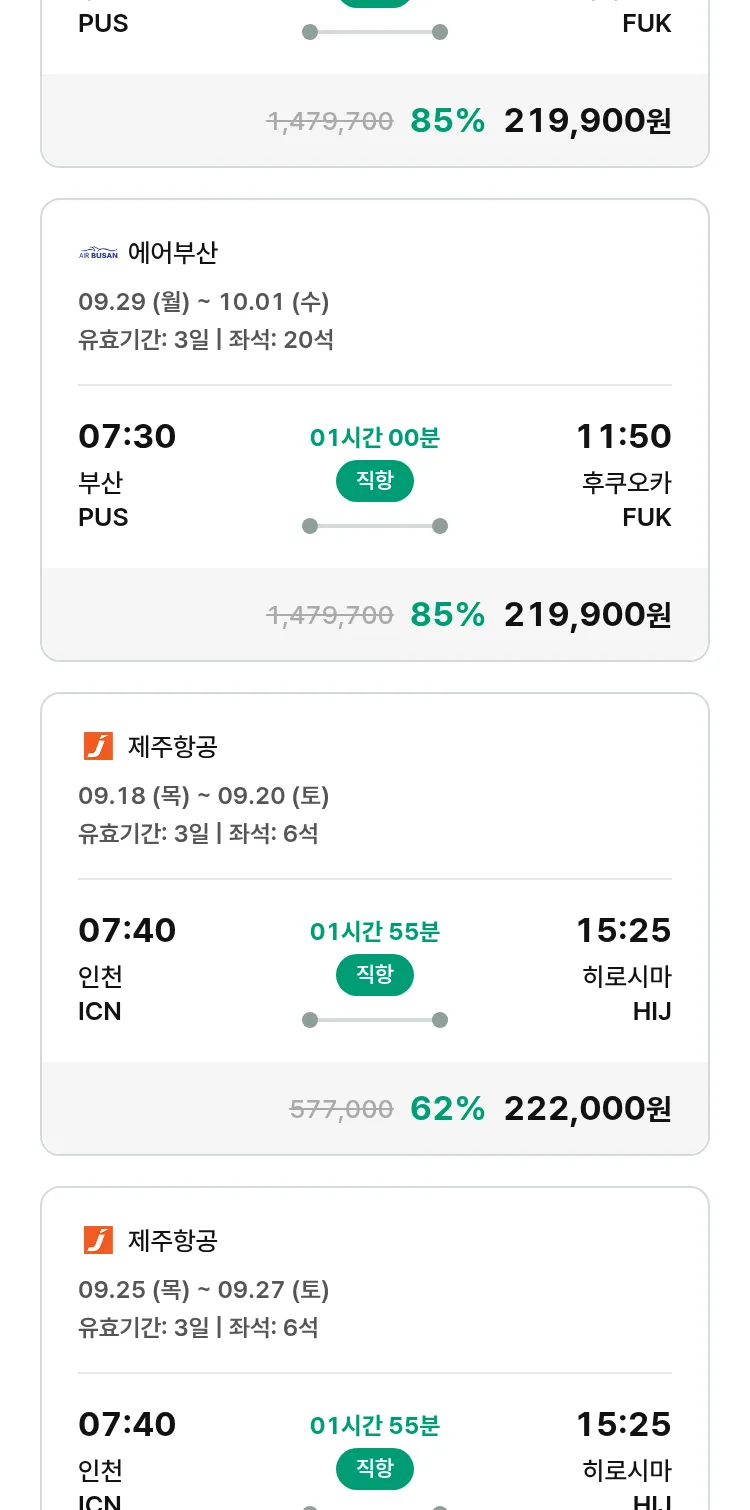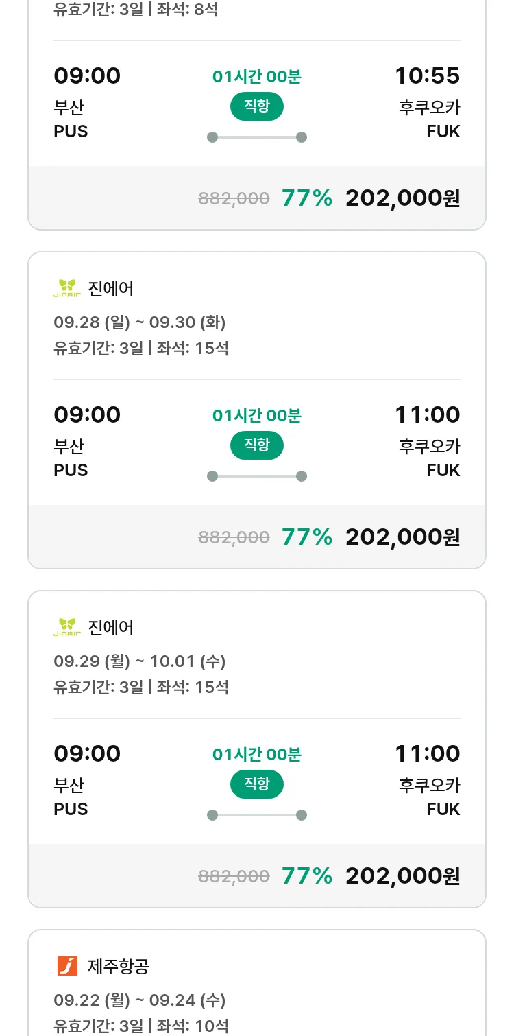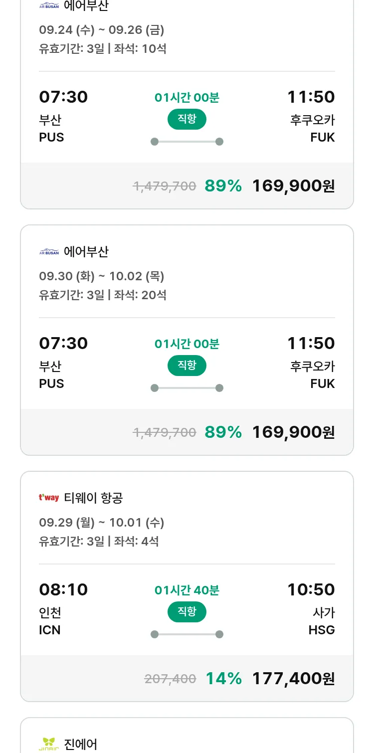 (9월8일(월)) 땡처리 99.9% 확정 항공권