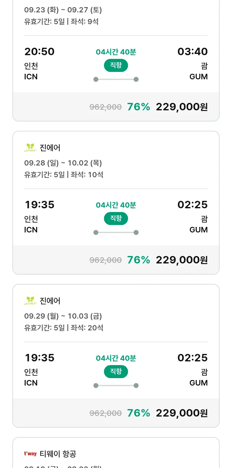 (9월8일(월)) 땡처리 99.9% 확정 항공권