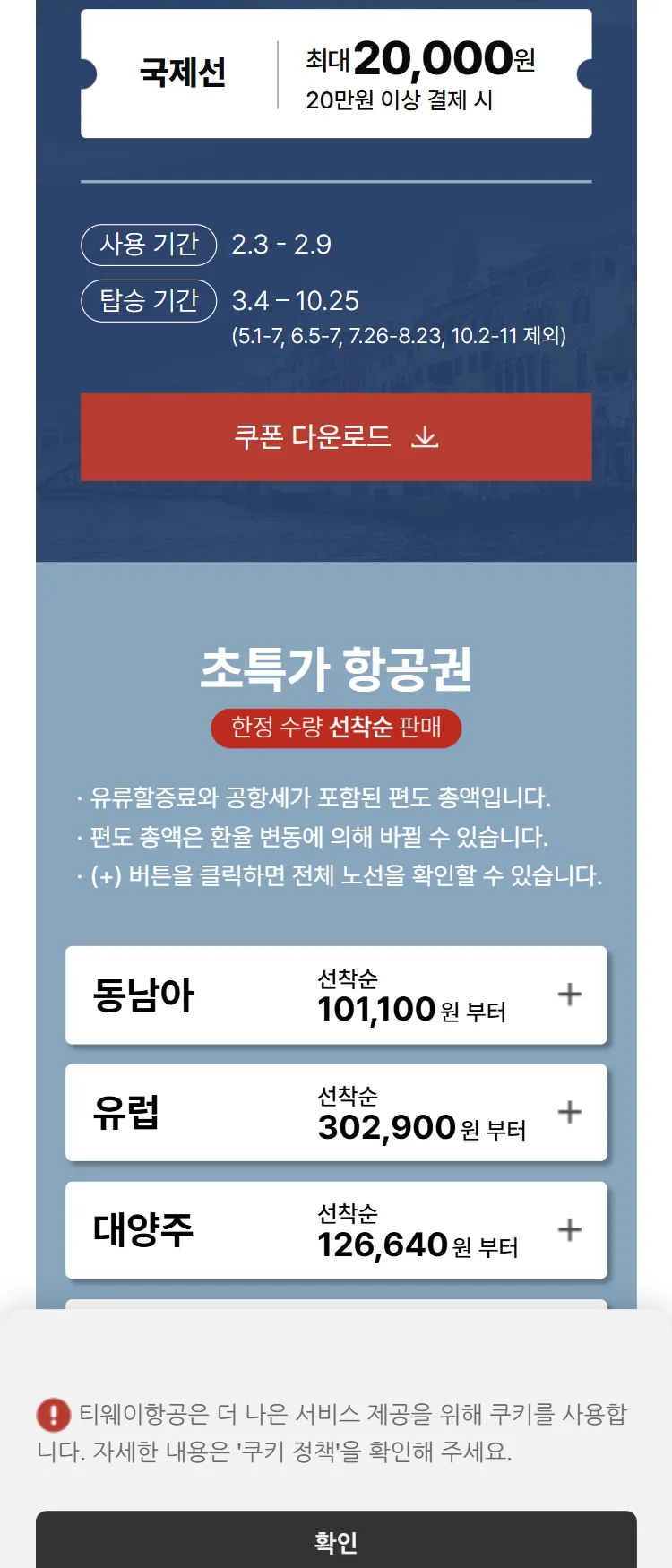 [티웨이]국제선 최대 15% 즉시 할인