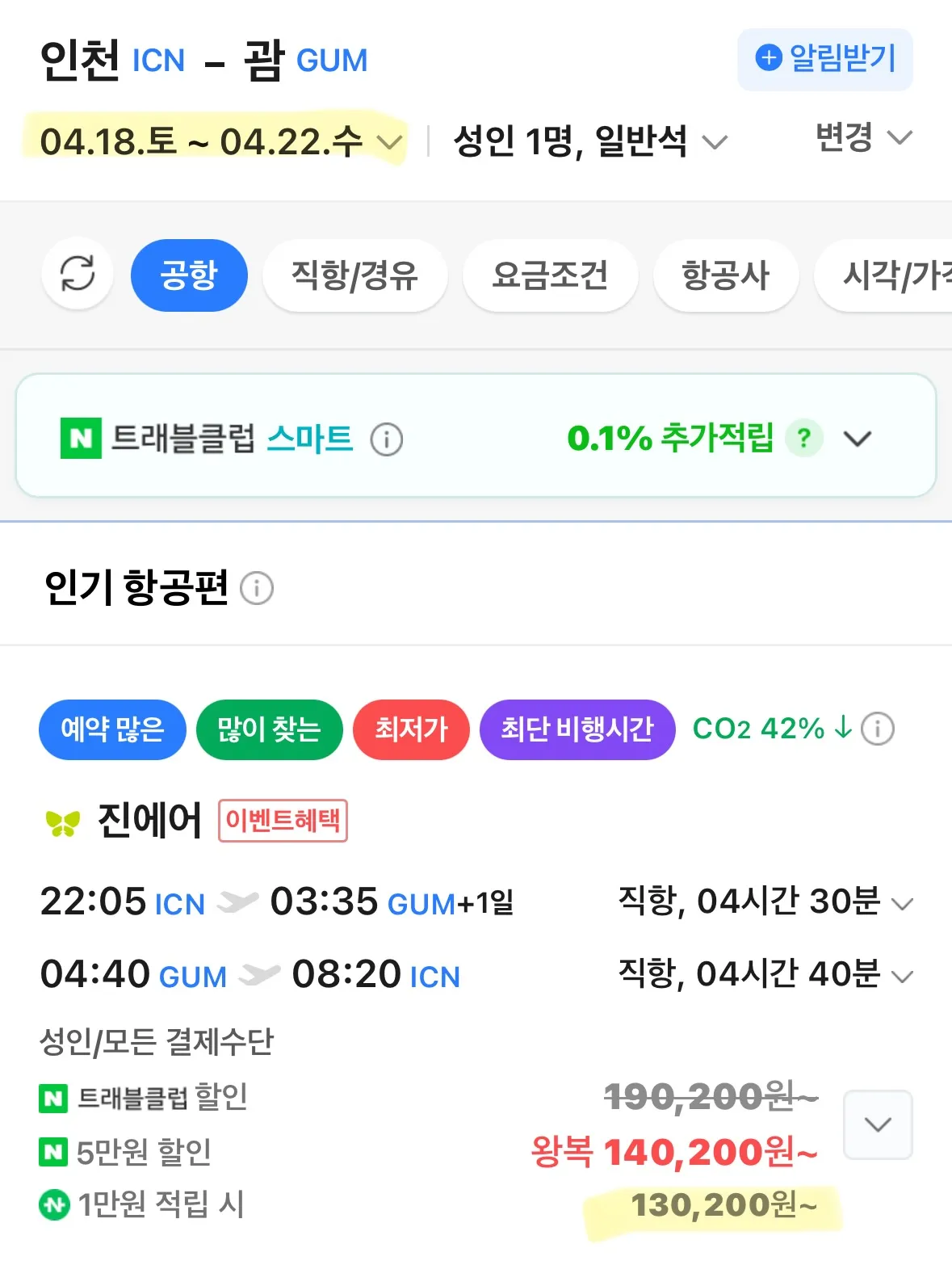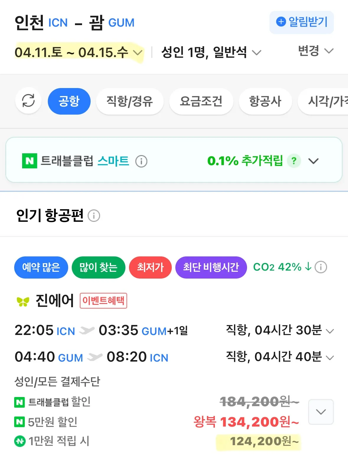 괌 여행 항공권 정보 - 서울 출발, 괌 도착, 왕복 약 12만 2천원