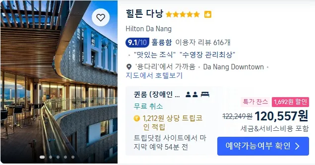 다낭 힐튼호텔에서 5성급 숙박을 즐겨보세요! 1박에 12만원, 아침 식사는 2만원 추가입니다.