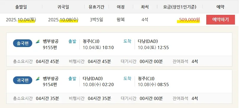 10월 4일 토요일부터 10월 8일 수요일까지, 청주-다낭 항공권이 50만원 초반대입니다.
