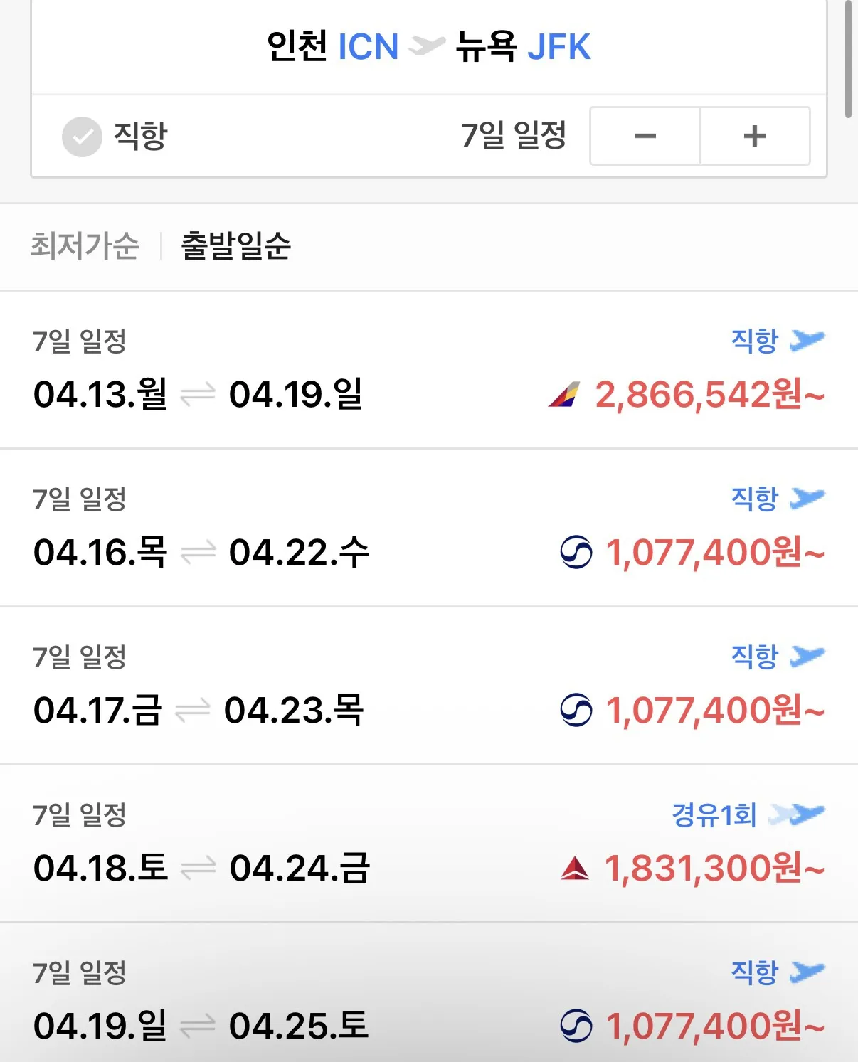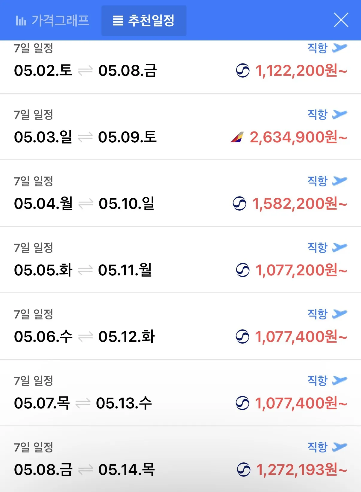 비슷한 시기에 아시아나 항공권도 105만원에 구매 가능하답니다.