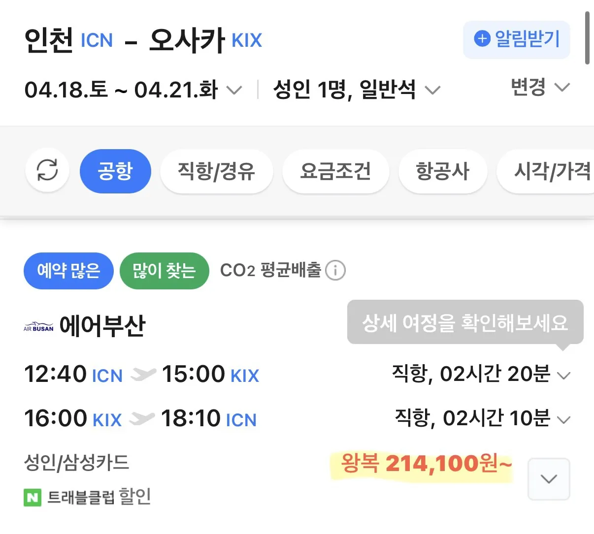 오사카로 가는 항공권은 토요일부터 화요일까지 출발하는 경우 21.4만원부터 시작해요.