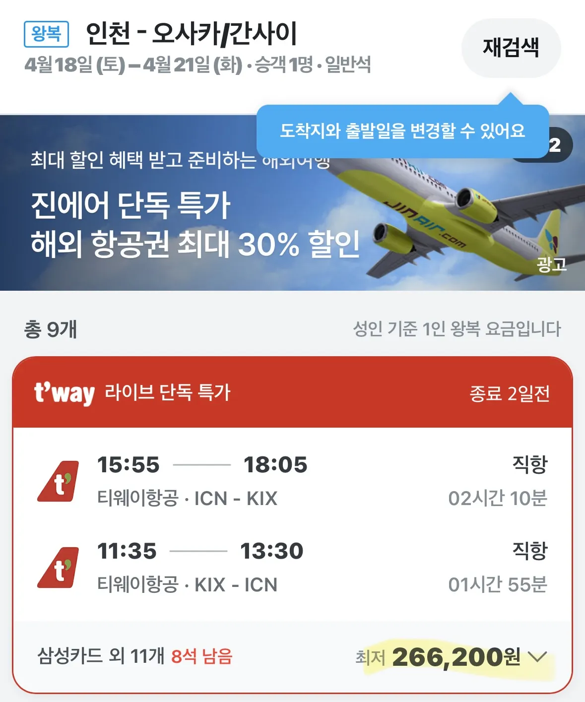 오사카로 떠나는 왕복 항공권은 26만원부터 시작하네요.