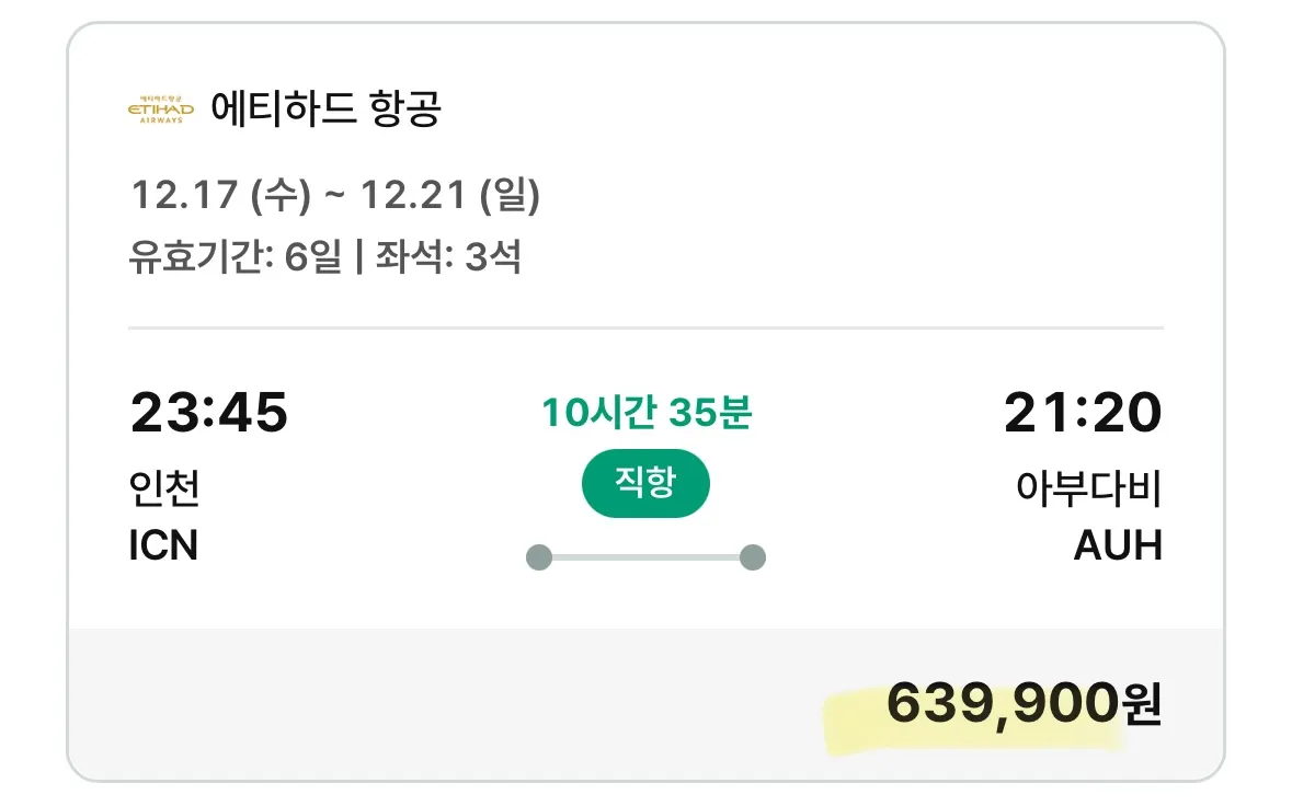 두바이 옆에 있는 아부다비로 가는 직항편도 찾을 수 있어요. 가격은 60만원대입니다.