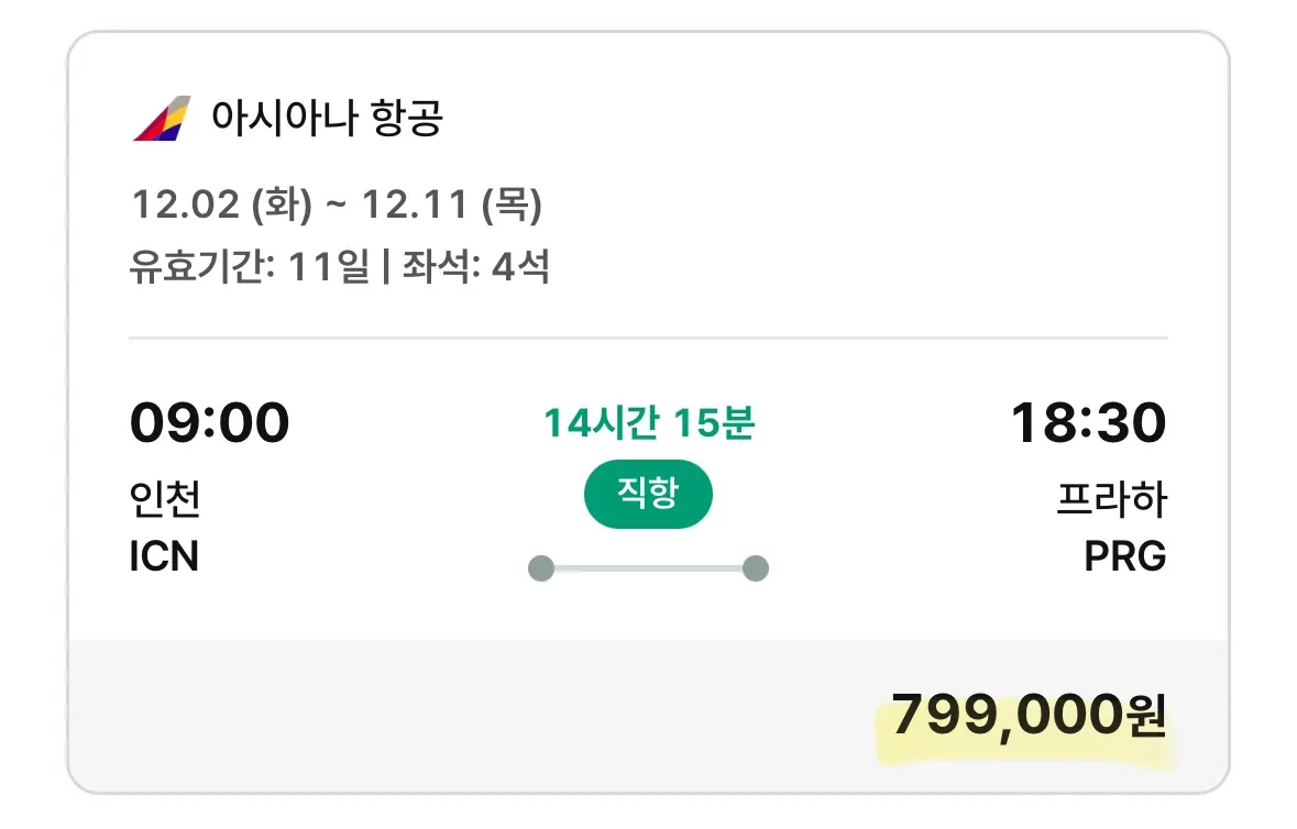 낭만적인 크리스마스를 꿈꾼다면 프라하를 추천드려요. 크리스마스 마켓 시즌인 프라하로 가는 직항편이 70만원대입니다.